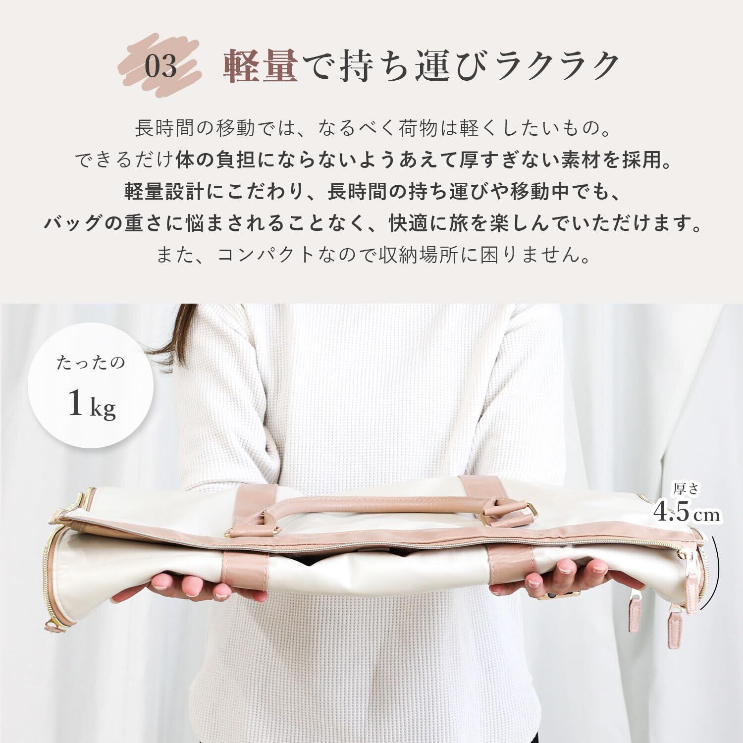【レディース特化のガーメントバッグ】スーツや結婚式のドレス、靴など、現地で着替えが必要な際、必要なものをまとめて持ち運べるガーメントバッグです。冠婚葬祭、出張、旅行、スポーツジム、ゴルフなど、ビジネスシーンやプライベートまで幅広くお使いいただけるシンプルなカラーをチョイスしました。当店オリジナルカラーです◎
