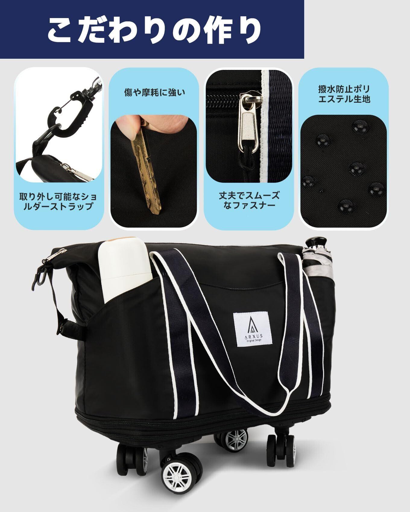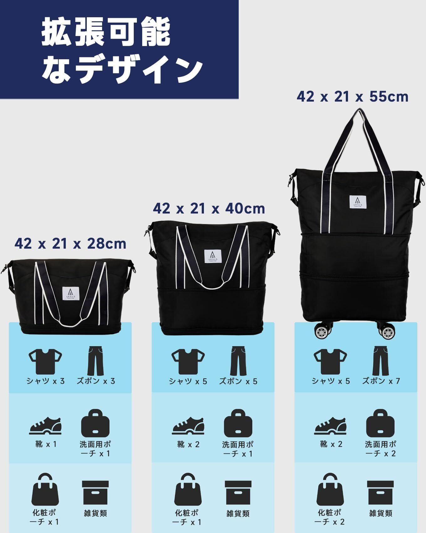 【特価商品】[Arxus] キャスター付きボストンバッグ carry on luggage キャリーバッグ 機内持ち込み 防災 折りたたみ 25L〜55L