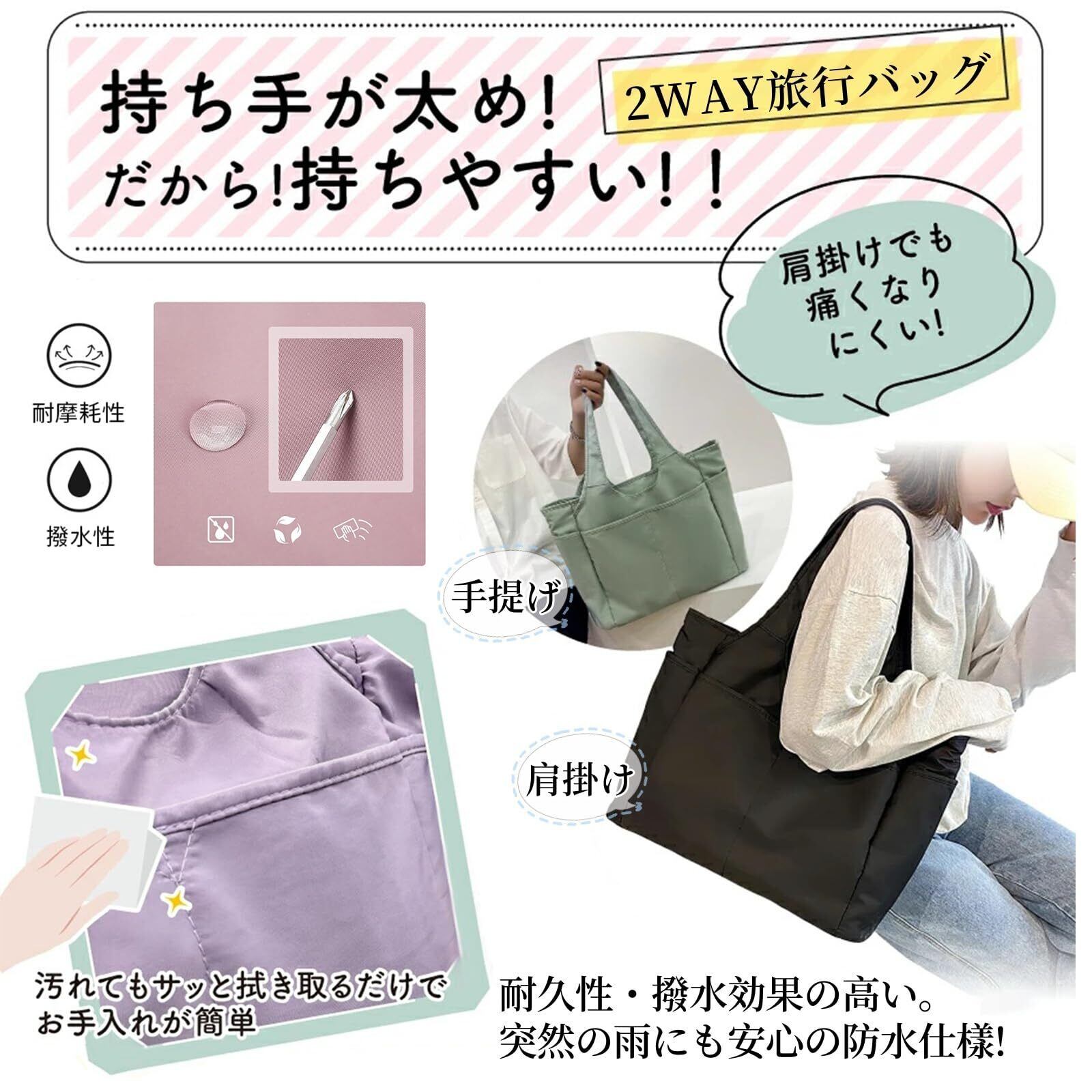 【撥水加工】耐久性・撥水効果の高い、高密度オックスフォード生地採用しているので急な雨でも大丈夫。生地は上品な光沢があり、傷もつきにくく、シワも出来にくいです。防汚性もあり汚れた場合もお手入れが簡単で、水で手洗い可能です。(洗濯機不可)