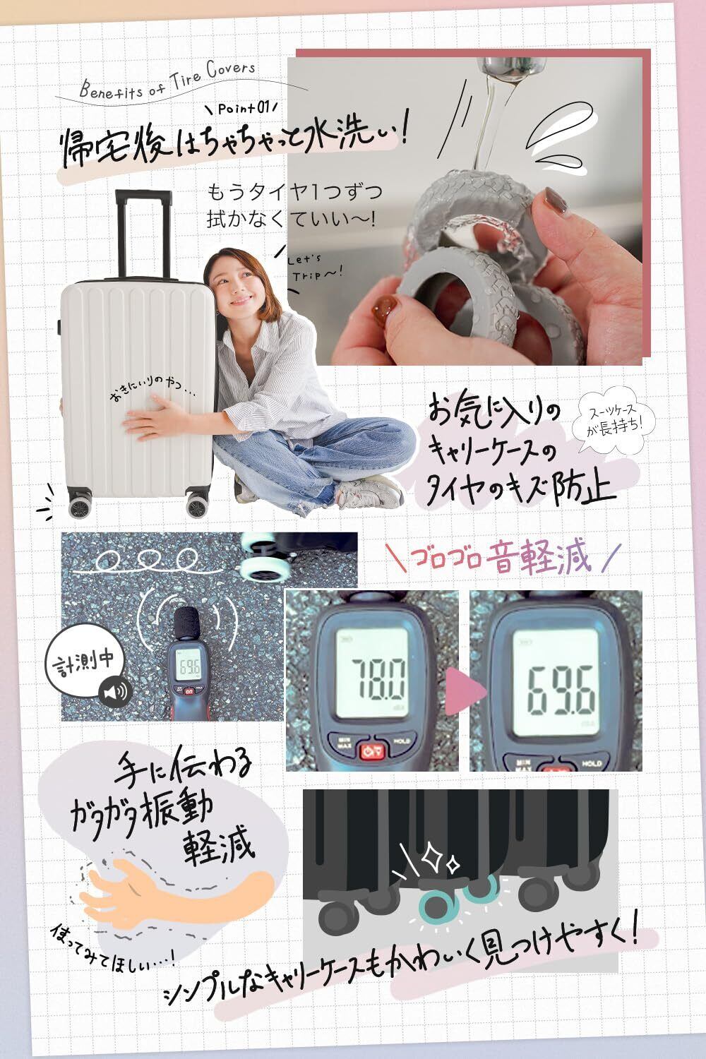 【滑り止め効果】 キャスターカバーの内側には特殊な滑り止め加工が施されており、タイヤにしっかりと固定されるため移動中もズレにくく、安心して使用できます。これにより、タイヤカバーがずれることによる摩耗や損傷を防ぎ、キャリーケースの寿命を延ばすことが可能です。安全で快適な移動を実現するための工夫が詰まっています。