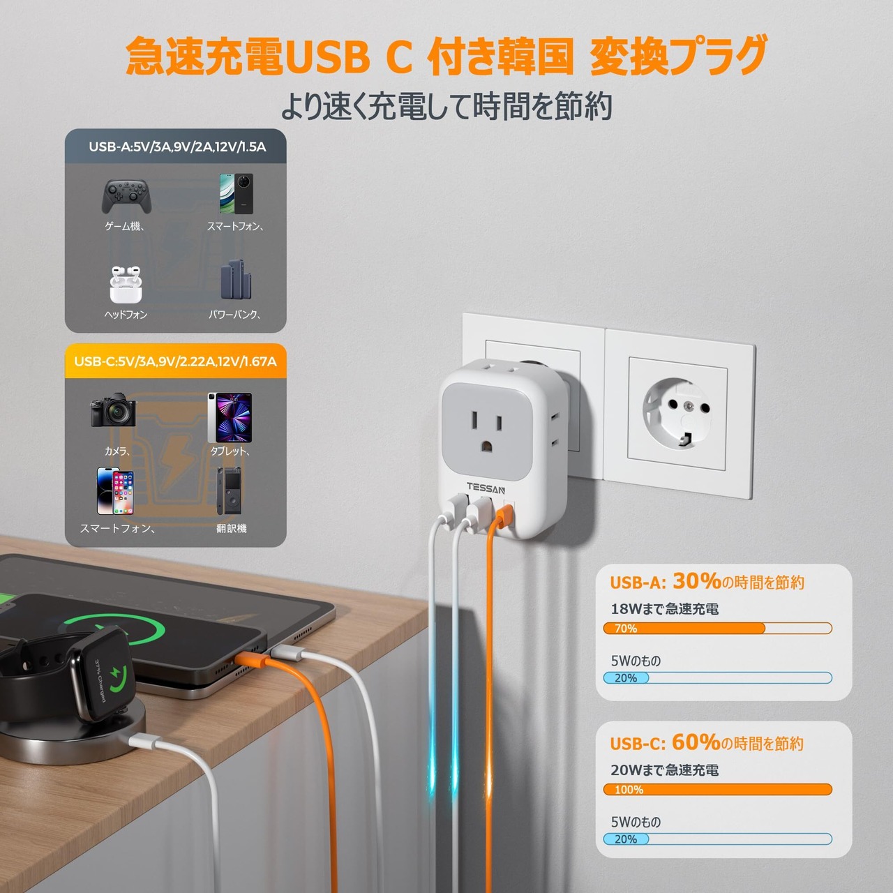 【新着商品】韓国 変換プラグ cタイプ TESSAN 折りたたみ式 C型 海外コンセント 変換プラグ 4個AC差込口 1つUSB-Cと2つUSB-A 変換器 電源変換アダプター ドイツ ベトナム タイヨーロッパ イタリア スペイン 海外旅行 便利グッズ