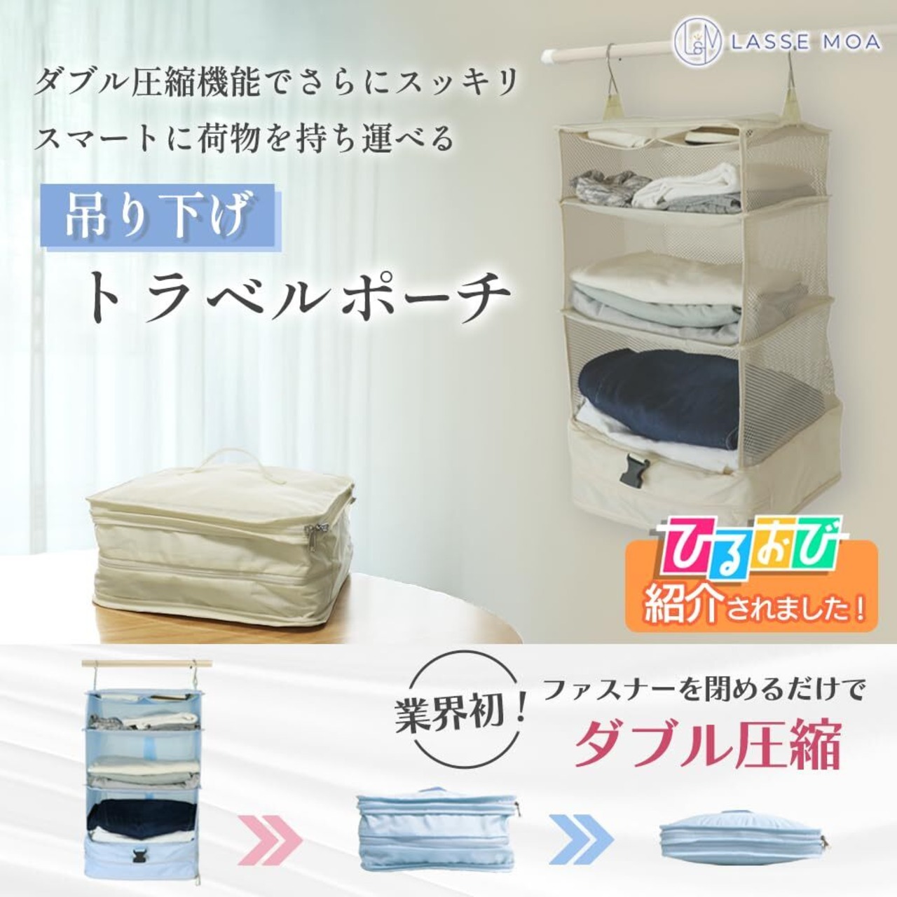 \「ひるおび」で紹介/ トラベルポーチ 吊り下げ 旅行用圧縮袋 【業界初”ダブル圧縮”でさらにコンパクト】 旅行 便利グッズ 衣類 収納 パッキング 意匠権取得済 LASSE MOA (ブラック, Lサイズ)