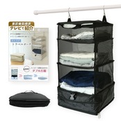 【 旅先でわずか20秒セットアップ 】 旅先で パッ と広げて、 クローゼット などに吊り下げるだけ。 4段 のスペースがあり、入れた荷物もすっきり収納できます。
