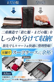 【両面ポケットで衣類をスッキリ分別】表裏で使えるダブルポケット構造を採用。着用済みの衣類と未使用の衣類を分けて収納でき、旅先でも清潔感を保ちつつスマートに整理整頓が可能です。旅行や出張中にありがちな「どれが使った服かわからない!」という悩みもこれ一つで解決します。