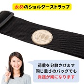 【太めのショルダーストラップ】標準で付いているストラップが細くて、荷物が重いと食い込んできて痛い。そんなお悩みを解決する、太めのショルダーストラップ バッグ用です。太さ3.8cmの幅広のストラップが、荷重を分散させます。同じ重さのバッグでも負担が楽になります。