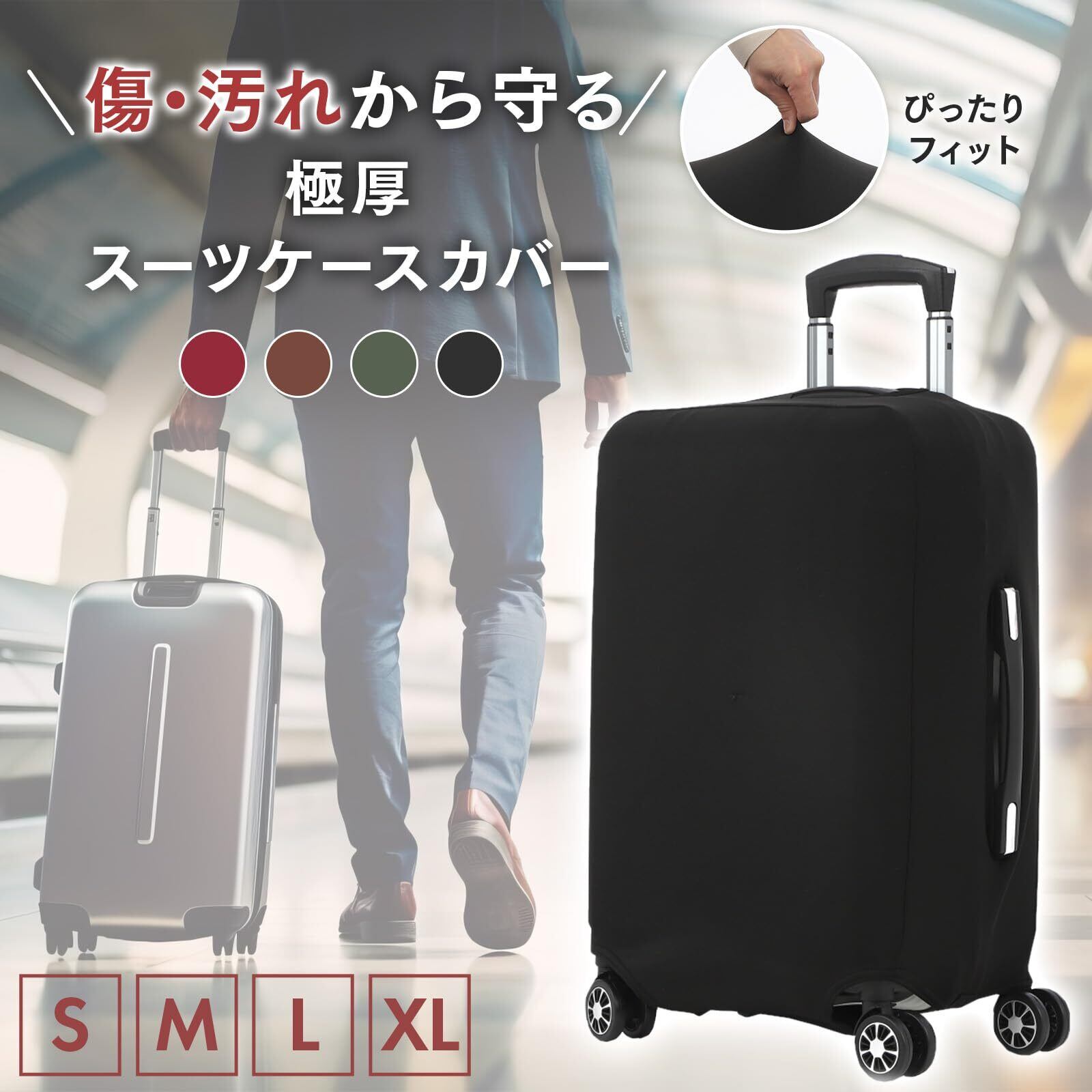 スーツケースをキズや汚れから保護します。全4サイズ展開で伸縮性のある素材のため、機内持ち込みサイズから大型のスーツケースまで幅広く対応可能です。