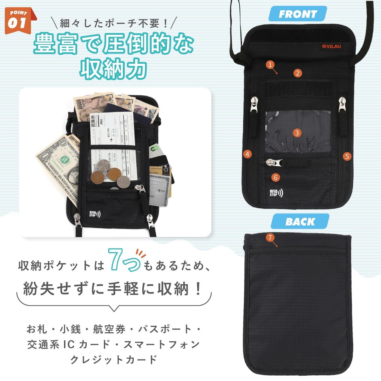 [VILAU] パスポートケース 首下げ スキミング防止【柔らかい首紐】 セキュリティポーチ 海外旅行 便利グッズ 便利 パスポートカバー ポリエステル 軽量 20.5cm×15.5cm×0.5cm