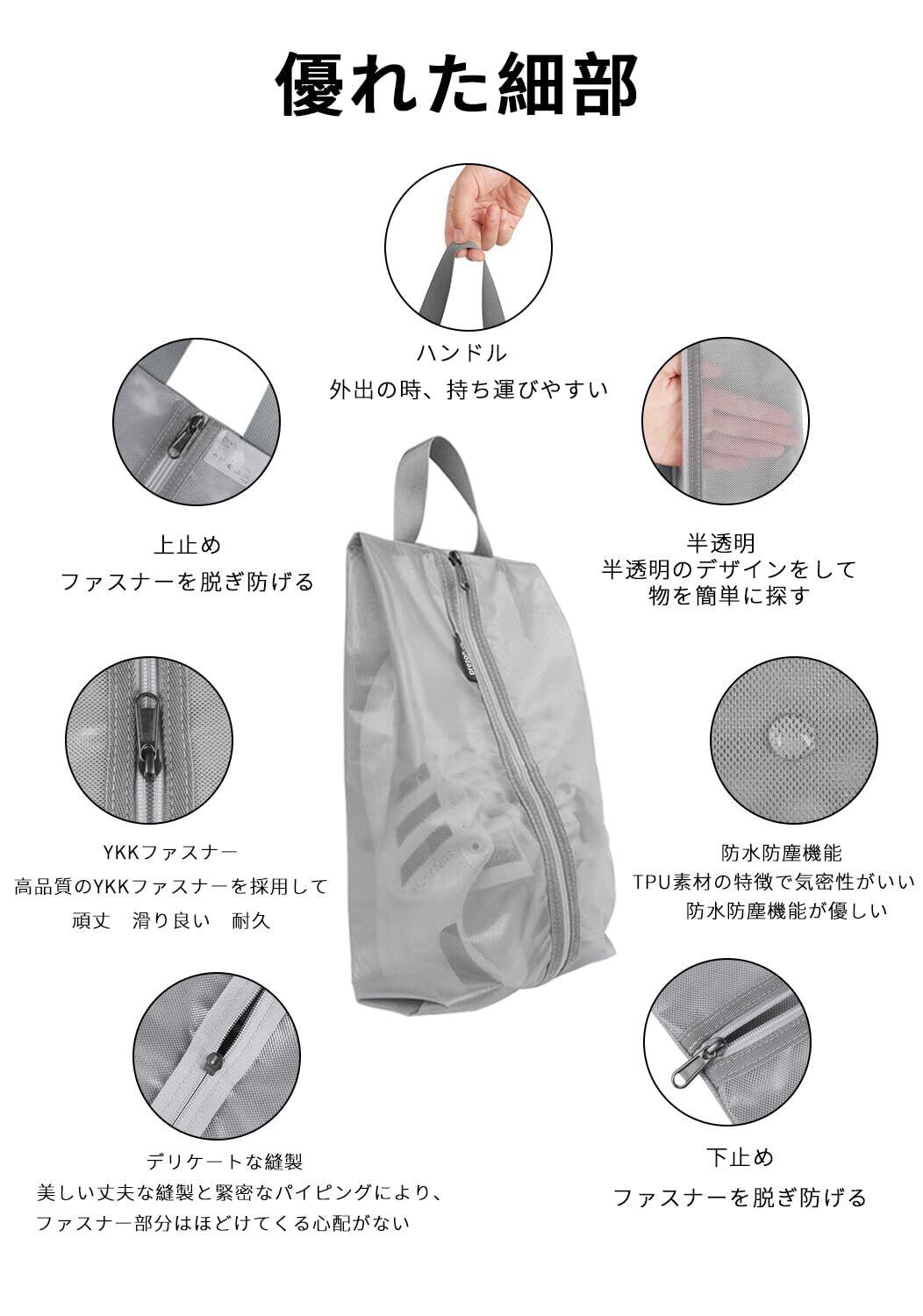 【デリケートな縫製 多機能】】シューズケースは全体にTPU(熱可塑性ポリウレタン)素材で作られて、高品質のYKKジッパーとこの上なくスムーズなジッパーの歯で、スムーズに開け閉めできます。ですので、簡単に壊れることはございません。ジッパーを中央にすることで簡単に物の出し入れができます。4種類の色からお好きなものをお選びいただけます。男女問わずご利用いただけます。 旅行、出張ではなく、山登り、スポーツ、ジム、遠足、キャンプなど靴の収納には非常に便利で、靴を入れて持ち運ぶことは簡単です。それだけでなく、化粧品や服などにも使え、家用の小物入れとしてもとても便利です。旅行用の収納バッグとしても、家用の防塵袋としても良いです。