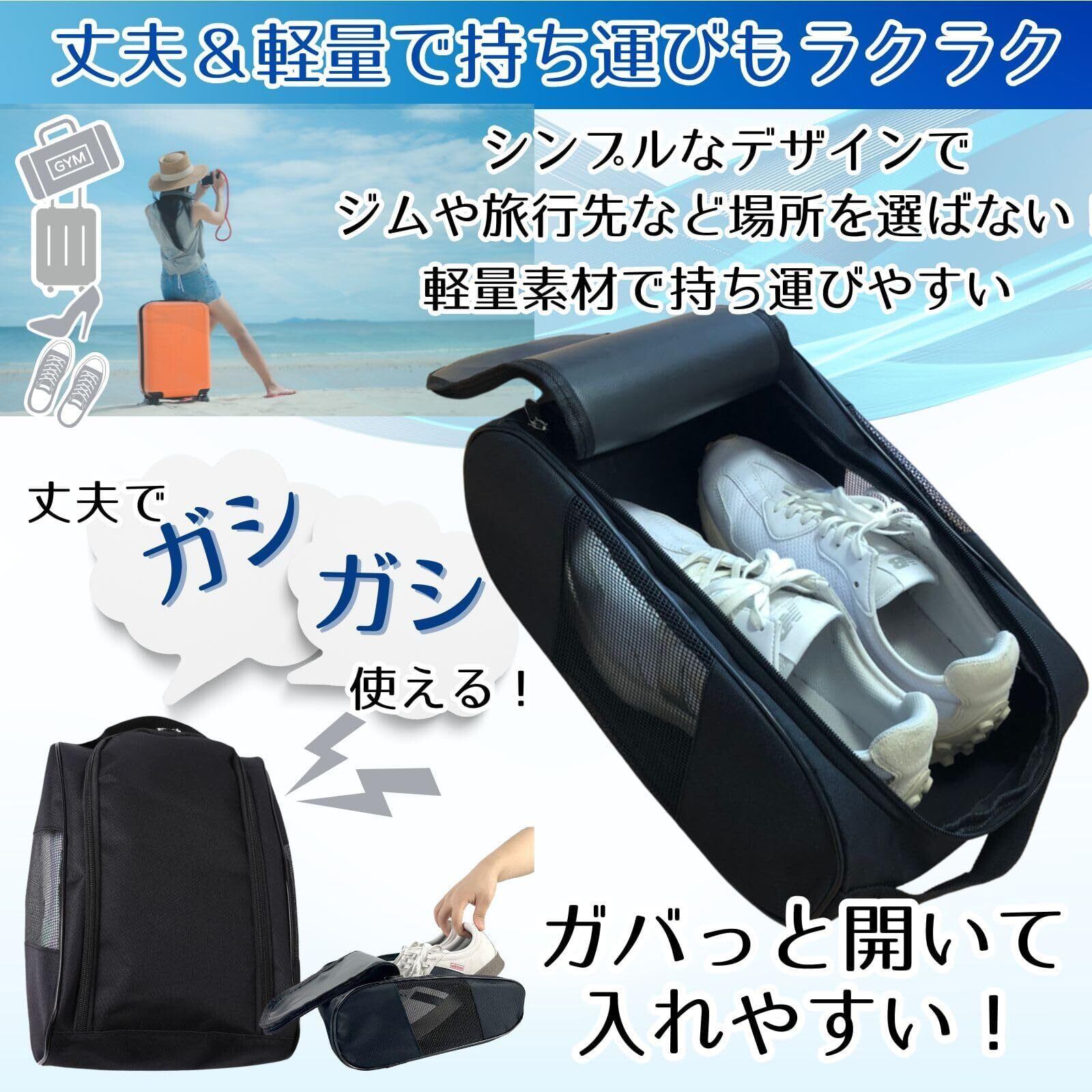 デザインはシンプルでスタイリッシュ、男女兼用で使えるため、あらゆる場面やスタイルにマッチします。カジュアルなシーンでも、ビジネスシーンでも違和感なく使える万能なデザインです。スニーカー、ランニングシューズ、ビジネスシューズなど、様々なタイプの靴を収納できる余裕のあるサイズ感もポイント。 毎日のジム通いやスポーツ、旅行先、仕事の場面で、足元のケアをサポートするシューズバッグ。この一つで、いつでも快適な履き心地をキープしましょう!