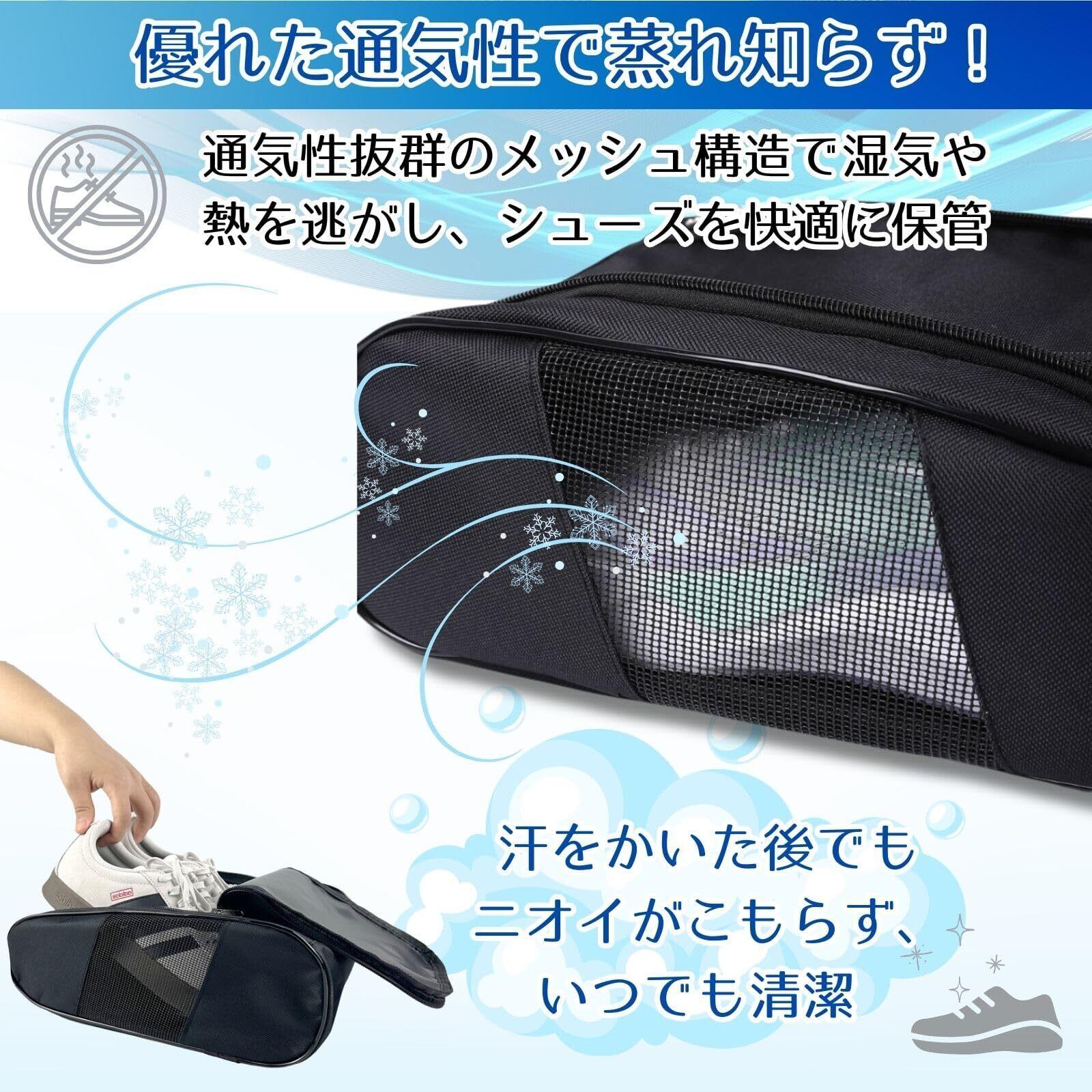 通気性抜群・シンプルなデザインでスタイリッシュなシューズバッグです。 スポーツや旅行、日常の外出先で使うシューズをいつでも快適に持ち運べる、メッシュ通気口付きのシューズバッグです。靴を収納しても蒸れにくく、通気性の良いデザインが特徴。メッシュ部分からしっかりと空気が循環するため、長時間使用後の靴でも、臭いや湿気がこもることなく、いつでも清潔に保てます。