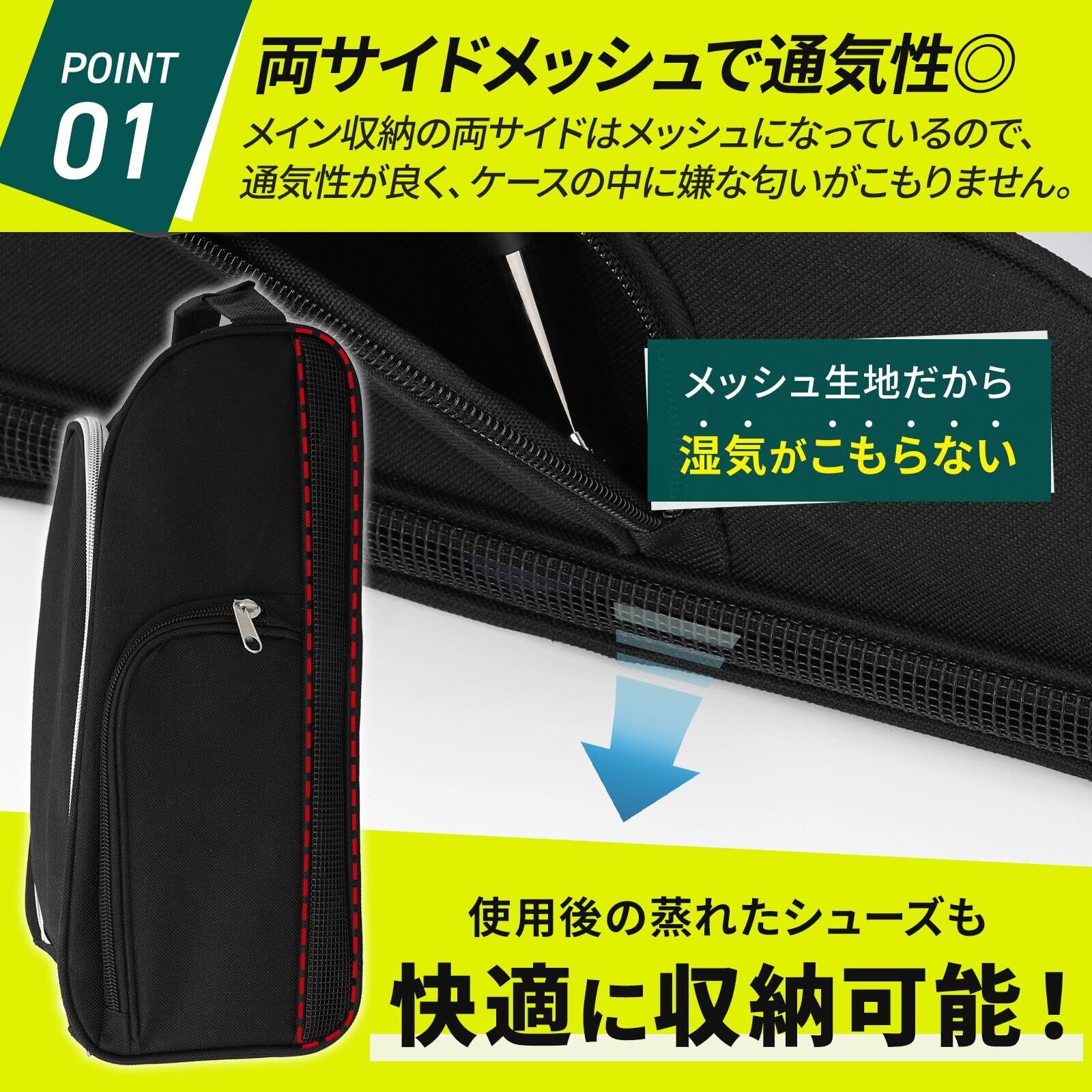 ・通気性:両側にメッシュ素材である為、シューズの気になるムレや匂いもこもりません。シンプルデザインなので出張時の革靴や上履き入れにも!