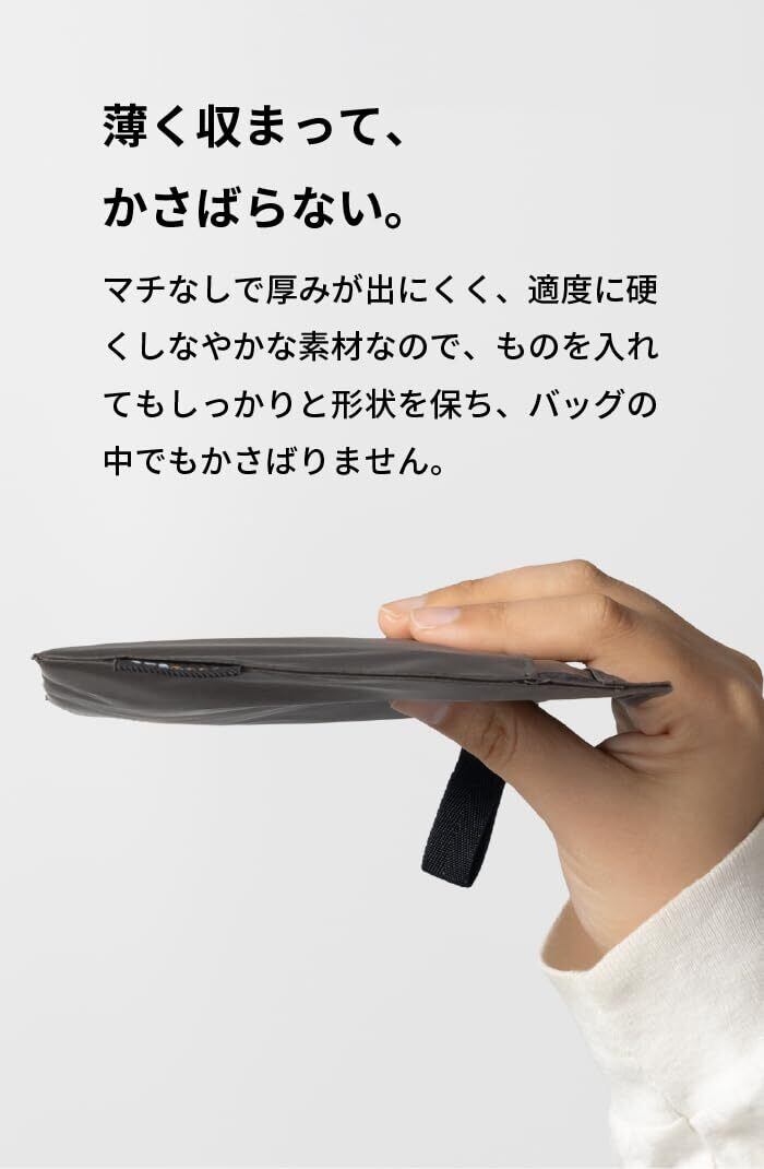 薄く収まって、かさばらない。 マチなしで厚みが出にくく、適度に硬くしなやかな素材なので、ものを入れてもしっかりと形状を保ち、バッグの中でもかさばりません。
