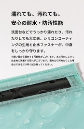 濡れても、汚れても、安心の耐水・防汚性能 洗面台などでうっかりぬれたり、汚れたりしても大丈夫。シリコンコーティングの生地と止水ファスナーが、中身をしっかり守ります。