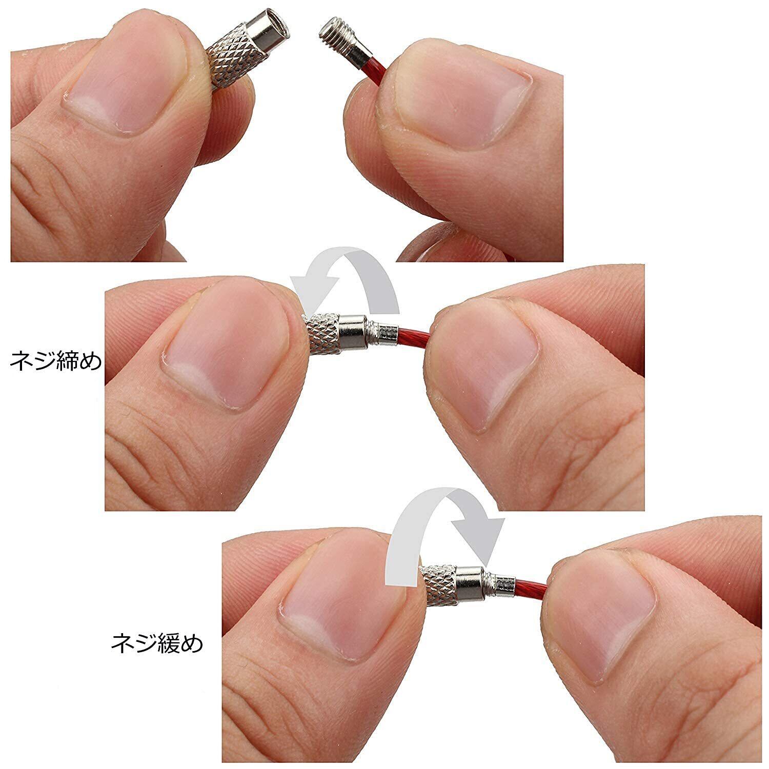 【製品仕様】このワイヤーリングキーホルダーは、コネクターを含めた全長は15cm、ケーブルの線径は約2mm、ねじは約3.2mmです。リングにした時の直径は5.0cm前後。コネクターもステンレスを採用、丈夫で重い物を吊ることができます。尚、1本の重さは僅か2gで、軽くて非常に使いやすいです。
