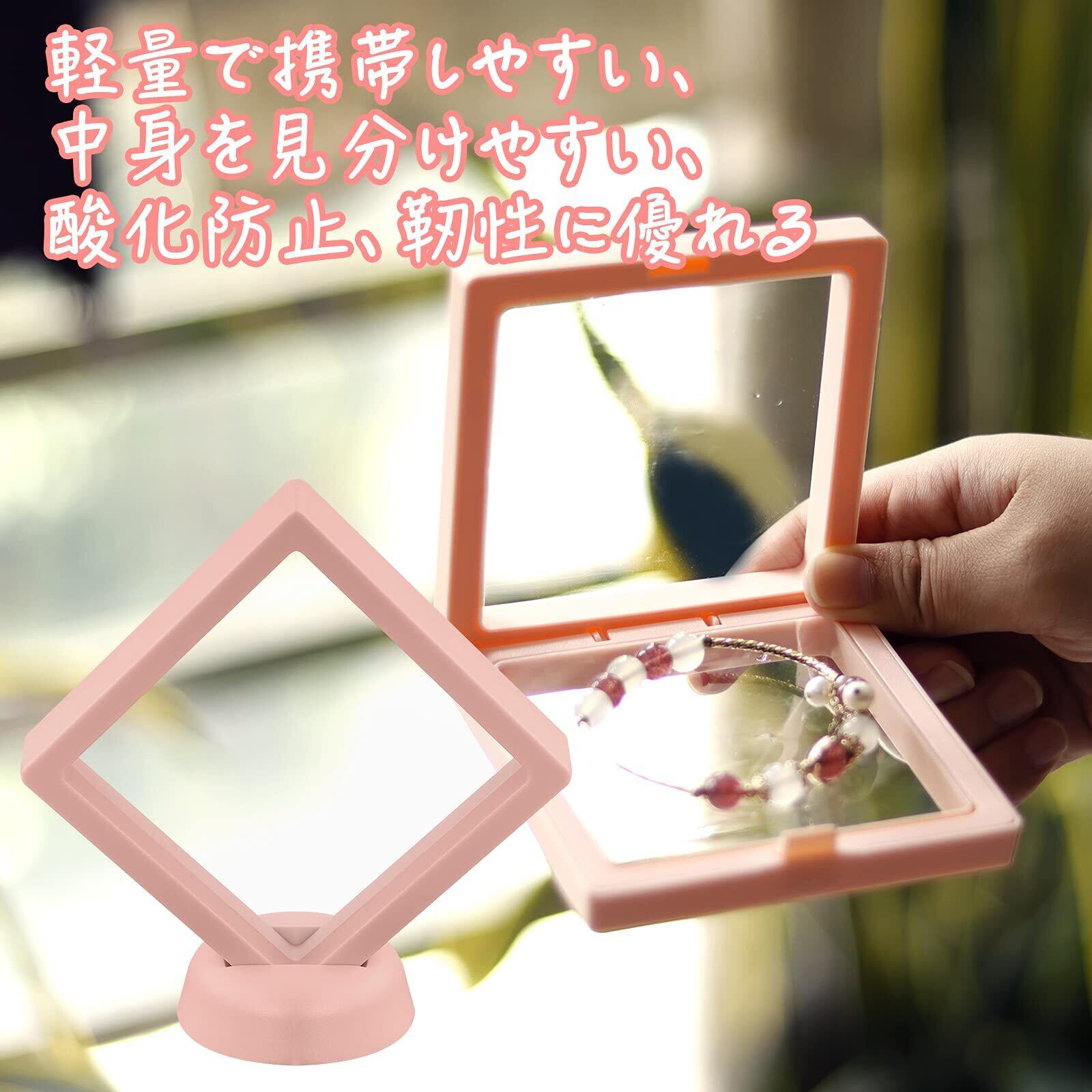 【使いやすい】ガラスよりも安全なPEフィルムの窓付きですので、一つずつ蓋を取って中身を確認する必要はありません。フローティングフレームディスプレイケースはジュエリーなどを立体的に、好きな角度で展示ができます。膜にシワができたときにはドライヤーで熱風をかけることで繰り返し使用できます。