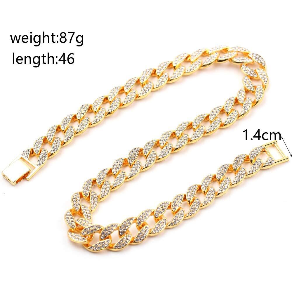 【素材とサイズ】 幅14mm、長さ約50cmの喜平チェーン。CZダイヤを使用しており、ゴージャスな輝きを楽しめます。18金メッキ加工で耐久性抜群。