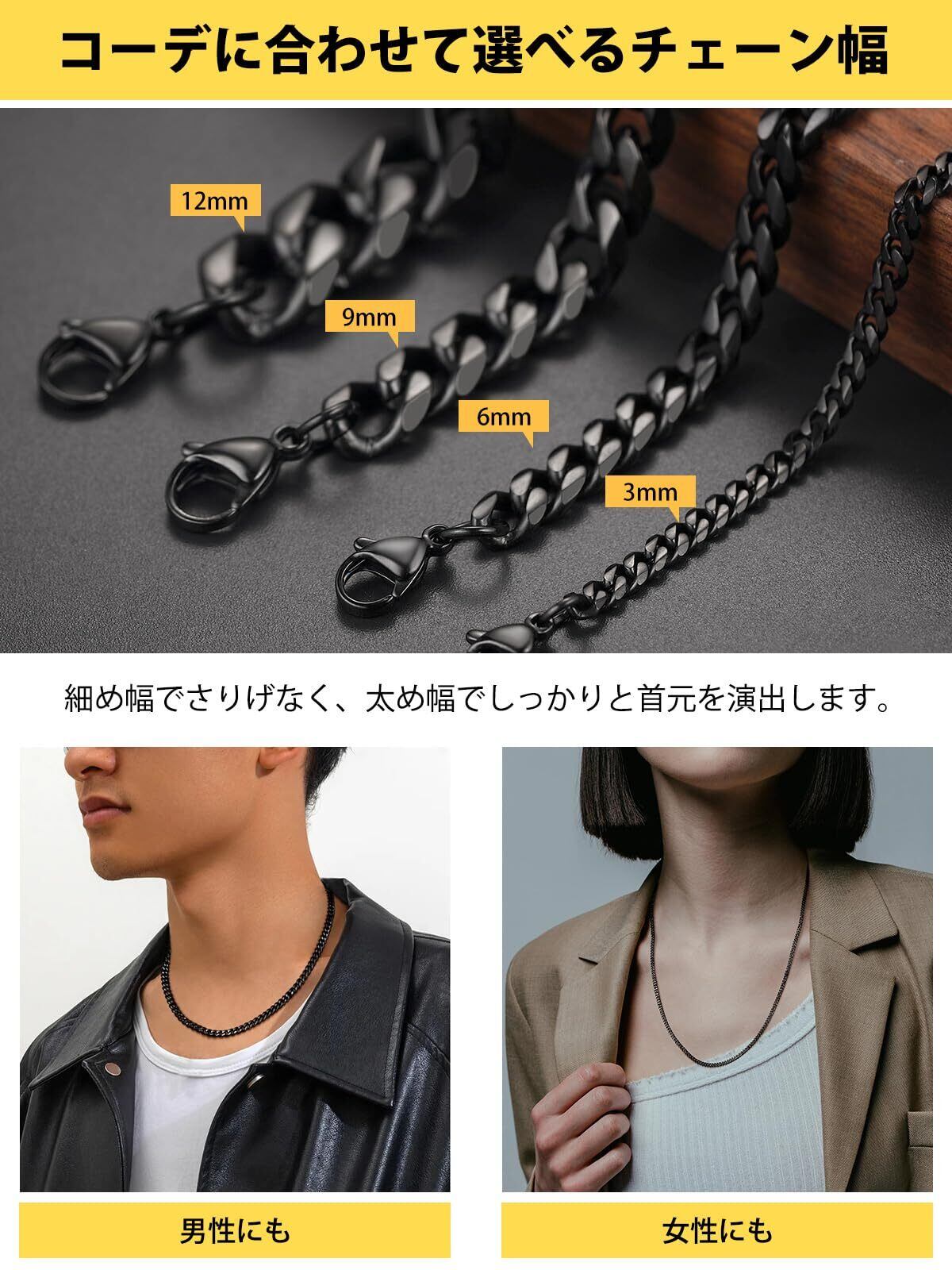 【色も!太さも!長さも選べる!】3mm、6mm、9mm、12mmの4太さ、シルバー、ゴールド、ブラックの3色、46cm、51cm、56cm、61cm、66cm、71cm、76cmの7長さ、全84種類を揃えました!