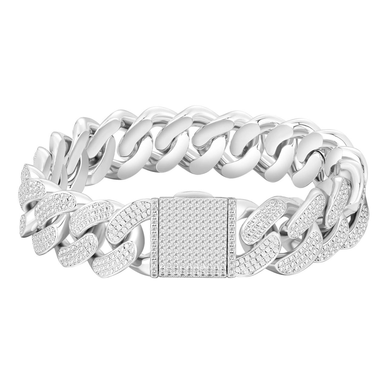 【存在感抜群のブレス】B系アクセの人気デザイン、マイアミキューバンリンクのチェーンブレスレット。表面には無数のジルコニアを散りばめており、光の当たり具合により輝きが魅力的に変化します。これ1本だけでも手元で圧倒的な存在感を発揮します。