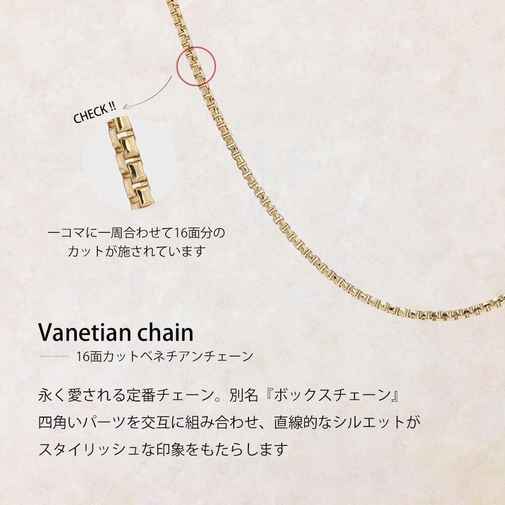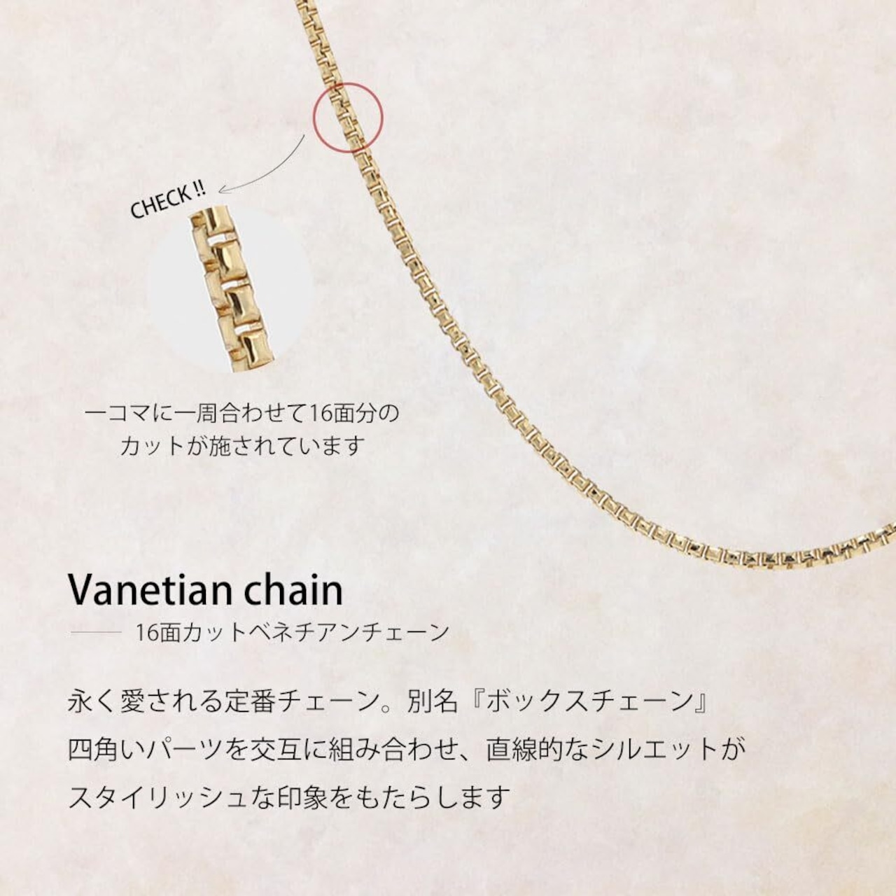 東証2部上場メーカー直販のチェーンネックレスです。ベネチアンチェーンネックレスの中の定番中の定番です。またの名をボックスチェーンと言い、四角い箱形で形成されています。その箱形は4面で構成されているのが一般的ですが、このネックレスは細かい表面加工を施すことで16の面で構成されています。この16の面により、従来のベネチアンより角が取れやや丸みを帯びた形状となり、優しく、上品に輝くネックレスです。日本国内ではなかなか出会えない商品です。お手持ちのペンダント用のチェーンにもお使いいただけます。当社工場の地名に由来する「LA SOMA」の刻印は品質・品位の証です。自信をもってお届けできる逸品です。