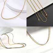 普段使いに最適なシンプルスネークチェーンネックレス!メンズにもレディースにも人気の高いデザインでどなたにでもおすすめできるシンプルなチェーンネックレス!そのままでもお持ちのネックレストップを合わせてもしっかりデザイン性のあるチェーンです。フォーマルスタイルにもカジュアルスタイルにも相性がよく、シーンを選ばずどんな時でも着用OK! カラーバリエーションはゴールドとシルバーの2色展開で太さは2mm、長さも各種取り揃えてあり、自分の好みにあったサイズを選択可能。サイズ違いのチェーンを重ねづけすることで、きれいな輝きで存在感を強調しオシャレにコーディネートすることができます。他のデザインと違い、絡まる事がないので安心!