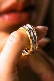 プルートゥリングのシャープな甲山リングをねじりあげて作り上げたステンレスリングです。全体がねじられたリングは、反射角度が通常のリングより多方面にあるため、輝きが周囲に差をつけます。