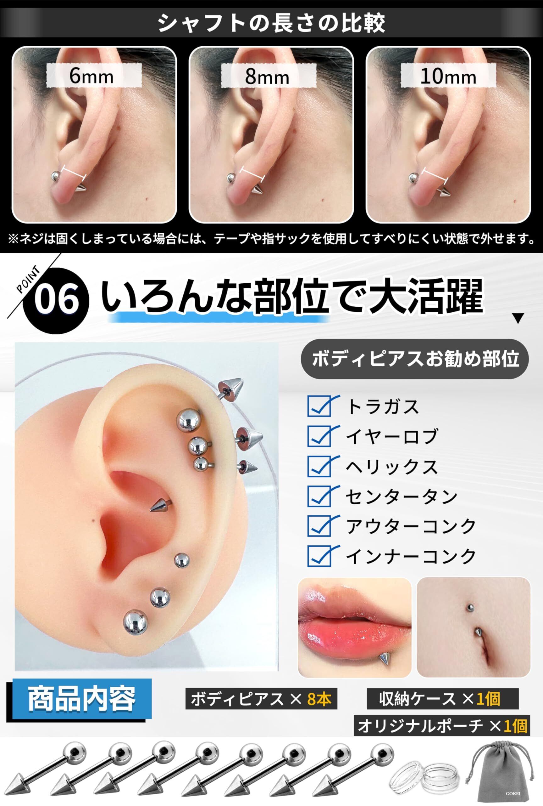 【内容・選べるサイズ】内容:8本ボディピアス + 収納ケース ※太さ(ゲージサイズ)14G/16G/18Gの3サイズ、軸長6mm/8mm/10mmの3種、コーンとボール内径は3mm/4mm/5mmの3種のボディピアスセット販売になります。