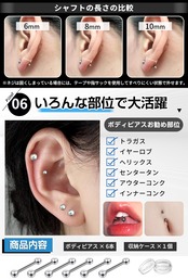 【内容・選べるサイズ】内容:8本ボディピアス + 1個収納ケース ※太さ(ゲージサイズ)14G/16G/18Gの3サイズ、軸長6mm/8mm/10mmの3種、ボール内径は3mm/4mm/5mmの3種のボディピアスセット販売になります。※薄さ、厚さ、ホールの角度により個人差がありますので自分に合った内径サイズをお求め下さい。