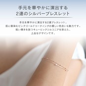 手元を華やかに演出する2連ブレスレット。肌に馴染むピンクゴールドコーティングの優しい色合いも魅力です。眩い輝きを放つキュービックジルコニアを添えた、女性らしさを引き立てるデザインです。