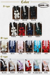 3【 おすすめコーディネート 】 ゴスロリは、全体的に「甘すぎず辛すぎず」を意識してコーディネートすると作りやすいです。また、全体が黒一色になることも好ましくないようですので、メインの服は黒をベースにして、ヘッドドレス小物などを赤、青、緑などのダークな色を差し色としてするのも良いです。本商品のリボンヘッドドレスは、3種類ありますのでお好みにあわせて活躍可能となっております。ゴスロリのワンポイントアイテムとして、お使い下さいませ