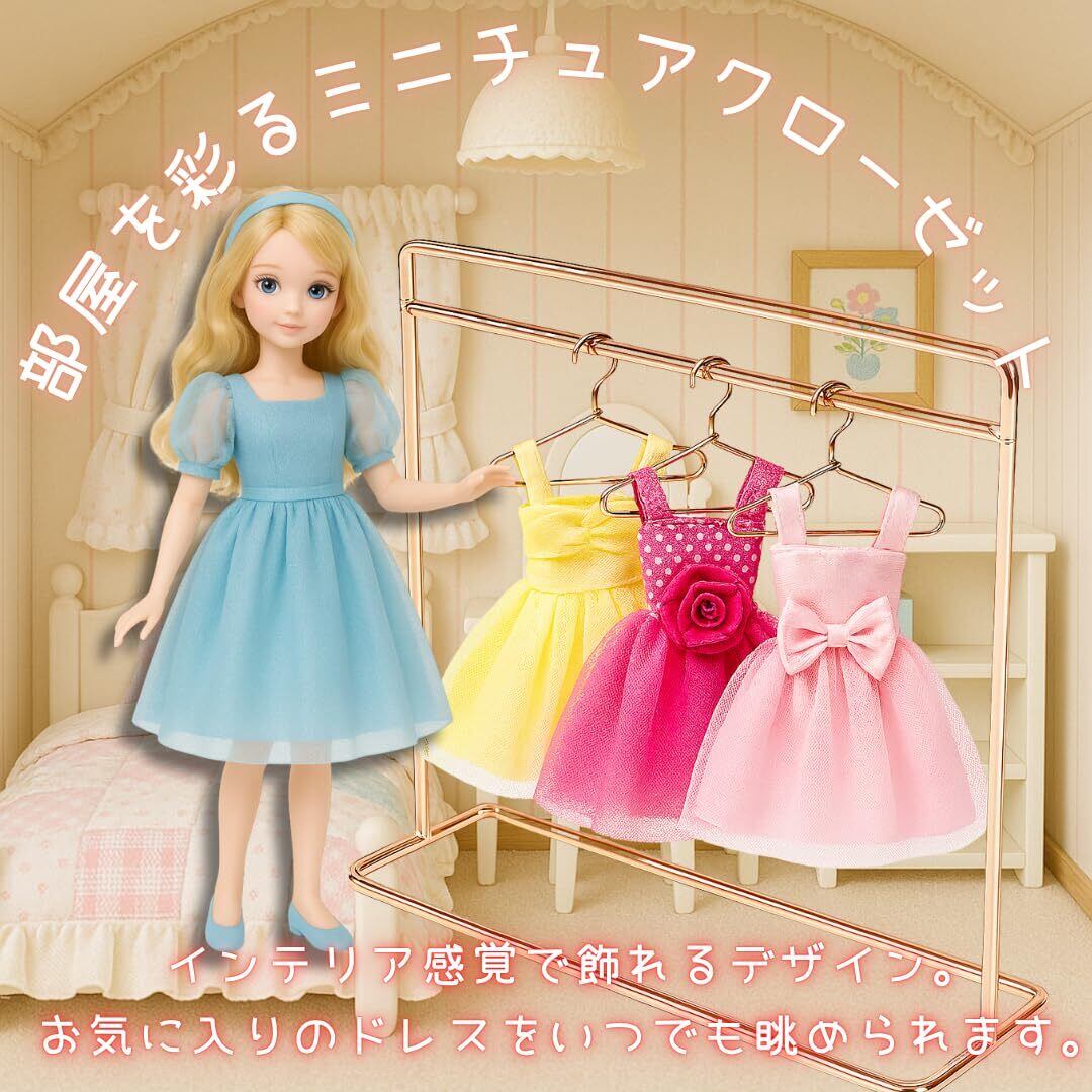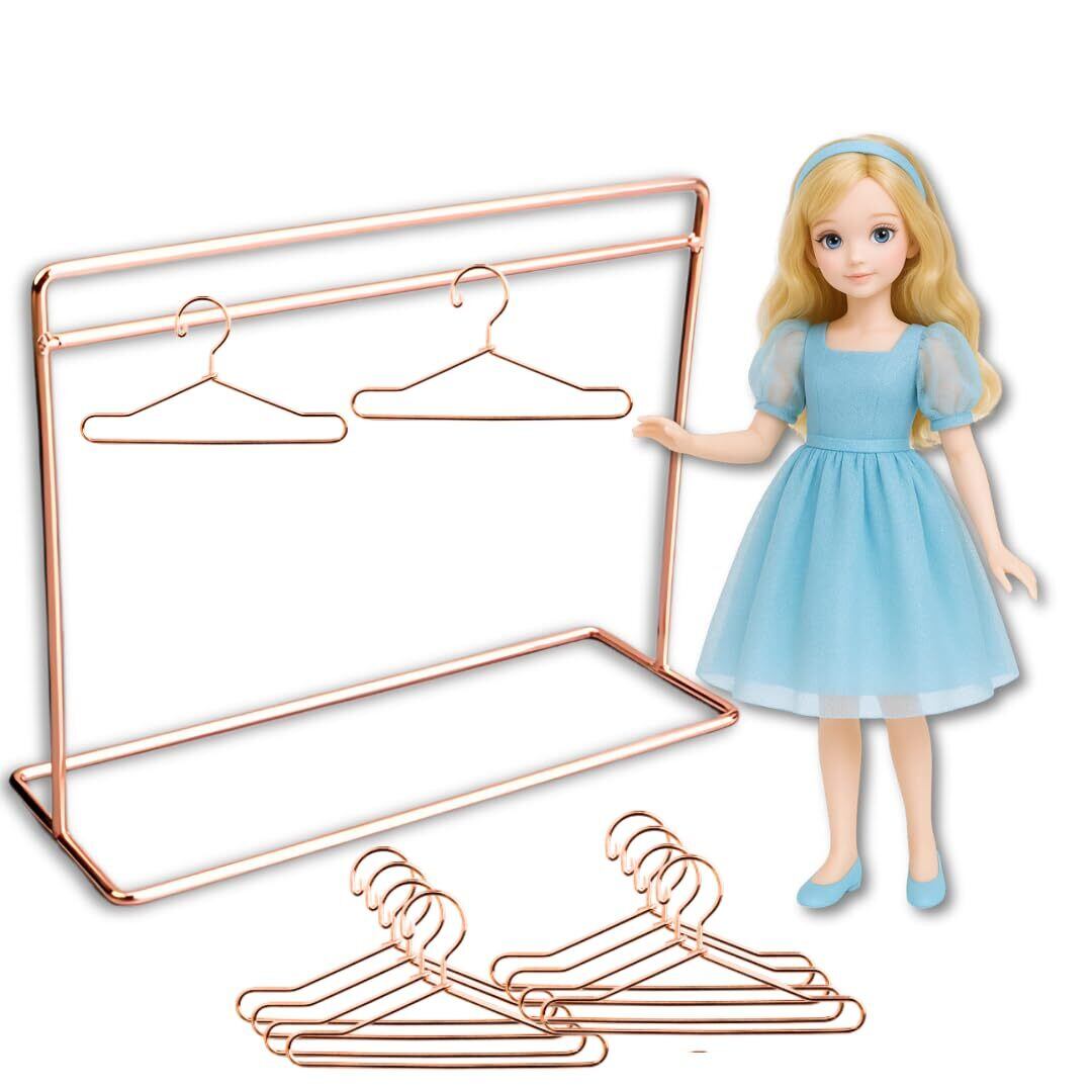 ドール用 ドール服収納 衣類ラック ミニチュア 洋服掛け 着せ替え人形用 28cmドール対応 ハンガーラック ハンガー10個セット ドール服 1/6 BJD 着せ替え人形服 衣類ラック (ローズゴールド)