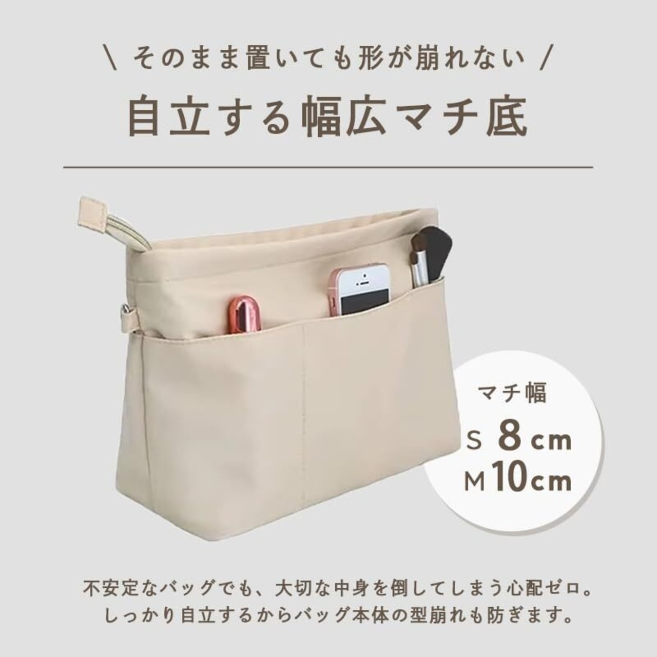 このアイテムは、トートバッグや大きなバッグの中をきれいに整頓するのに最適で、特に女性におすすめです。サイズはS、Mの2種類あり、詳細は商品画像でご確認いただけます。