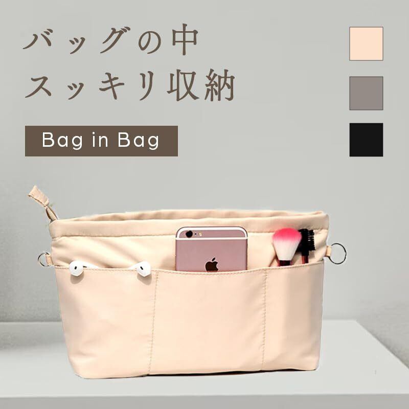 商品名: 化粧ポーチ・バッグインバッグ 丈夫で軽やかなナイロン素材を採用した、便利なバッグインバッグです。シンプルで使いやすいデザインに、3色のカラーオプション(ブラック・グレー・ベージュ)をご用意しています。 このアイテムは、トートバッグや大きなバッグの中をきれいに整頓するのに最適で、特に女性におすすめです。サイズはS、Mの2種類あり、詳細は商品画像でご確認いただけます。 画面設定により色味が異なる場合があり、また入荷時期によって袋のデザインが変更となる場合があります。 バッグの中をすっきり整頓しつつ、スタイリッシュに仕上げたい方におすすめのアイテムです。 素材: ナイロン カラー展開: ブラック、グレー、ベージュ サイズオプション: S / M (詳細サイズは画像をご確認ください) 注意事項: お使いのモニターにより実物と色が異なる場合がございます。また、入荷時期により袋のデザインが異なることがございます。