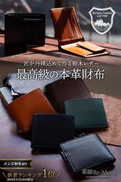 【ブランド】 革師RE-MEN’S/【商品名】 『革師の二つ折り』(栃木レザー)/ 【素材】栃木レザー株式会社のヌメ革 / 【カラー】 5通り(ブラック、ダークブラウン、ネイビー、キャメル、グリーン)