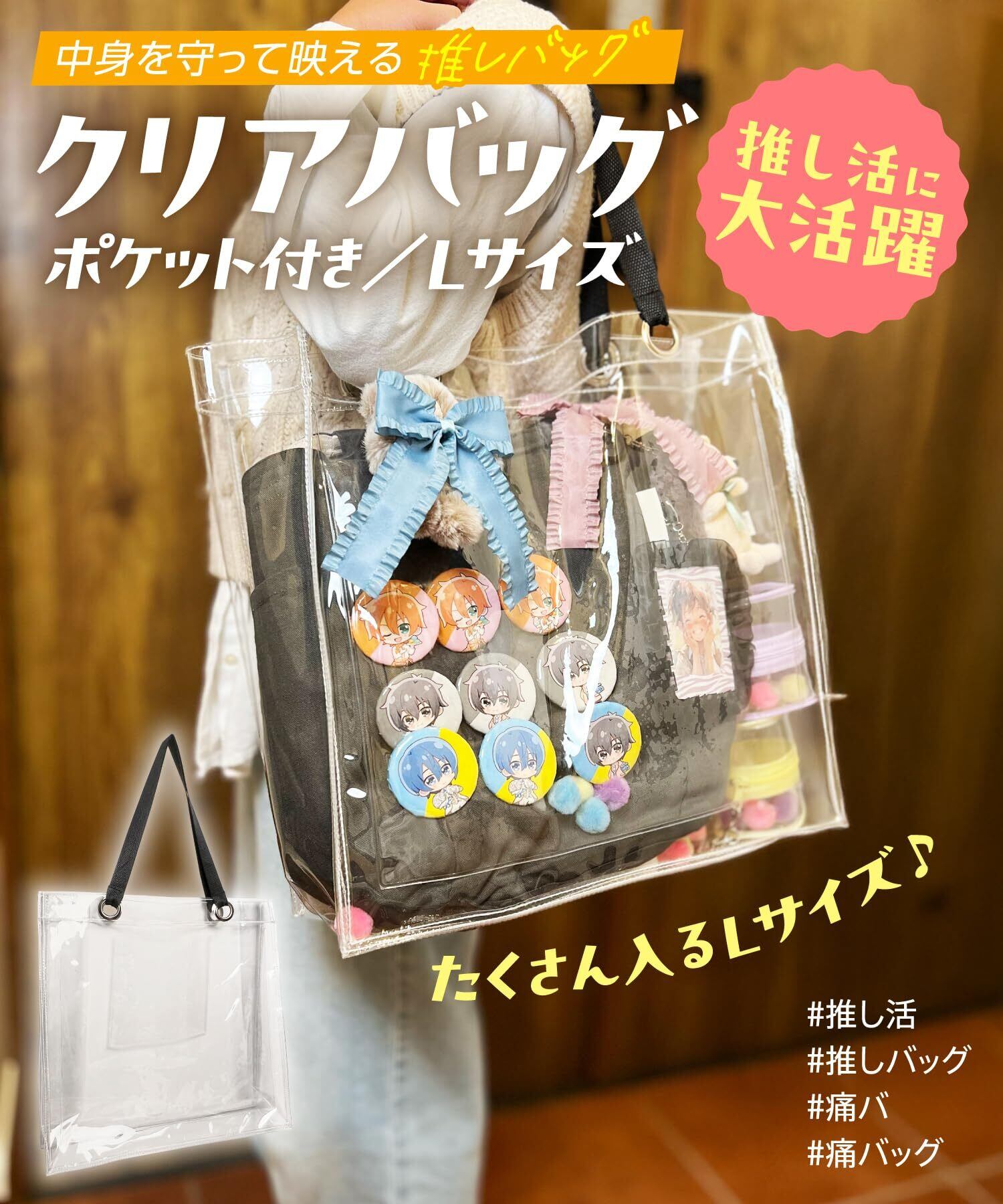 【魅力的な5つのおすすめポイント】丈夫で厚手の生地を使用し、破れにくいので安心して長く使えます。広いマチによる大容量で使いやすく、透明な素材が推しグッズを綺麗に見せます。さらに、急な雨にも大切なアイテムを守り、お気に入りのバッグを中に入れることで可愛さがさらに引き立ちます。