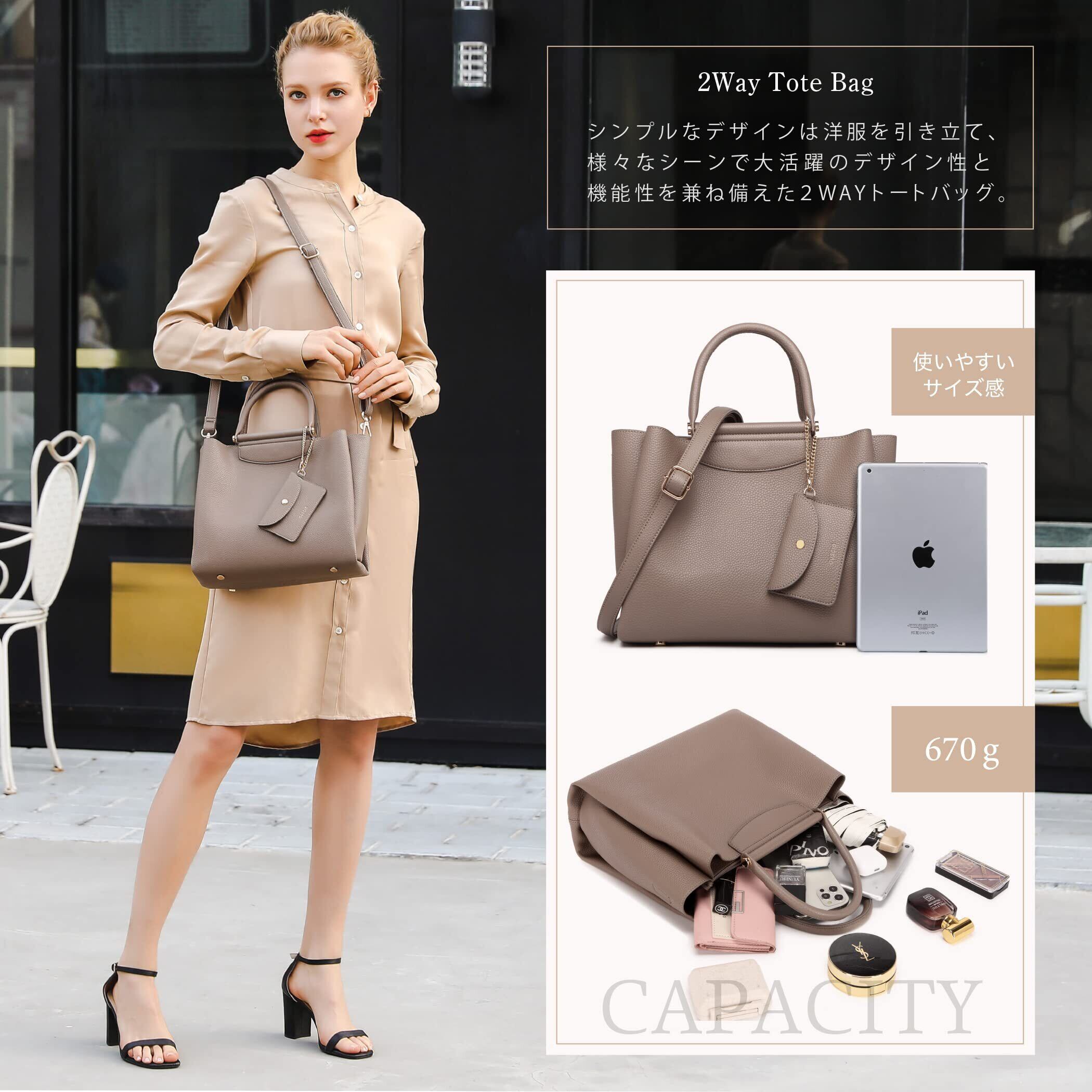 シンプルなデザインは洋服を引き立て、様々なシーンで大活躍のデザイン性と機能性を兼ね備えた2WAYトートバッグ。 ①バーハンドルはショルダースタイルの際にハンドルが邪魔にならず使いやすい。②便利なあおりポケットは荷物の整理がしやすい。③素材は本革の様な上質でしなやかなPUレザーを使用④しっかりと広めのマチはお弁当やペットボトルも入るサイズ感。⑤自立でき、底鋲があるのも嬉しいポイント。