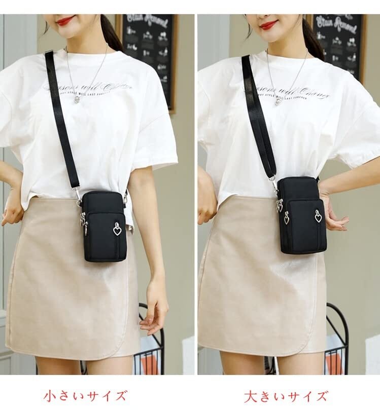 【サイズ】大きいサイズ:長さ19cm、幅10cm、マチ5cm、ストラップ長さ:69ー124cm。 小さいサイズ:長さ17cm、幅9cm、マチ5cm、ストラップ長さ:69ー124cm。【素材】ナイロン。7.2インチ(大きいサイズ)、6.5インチ(小さいサイズ)以下のスマホなら収納できます。
