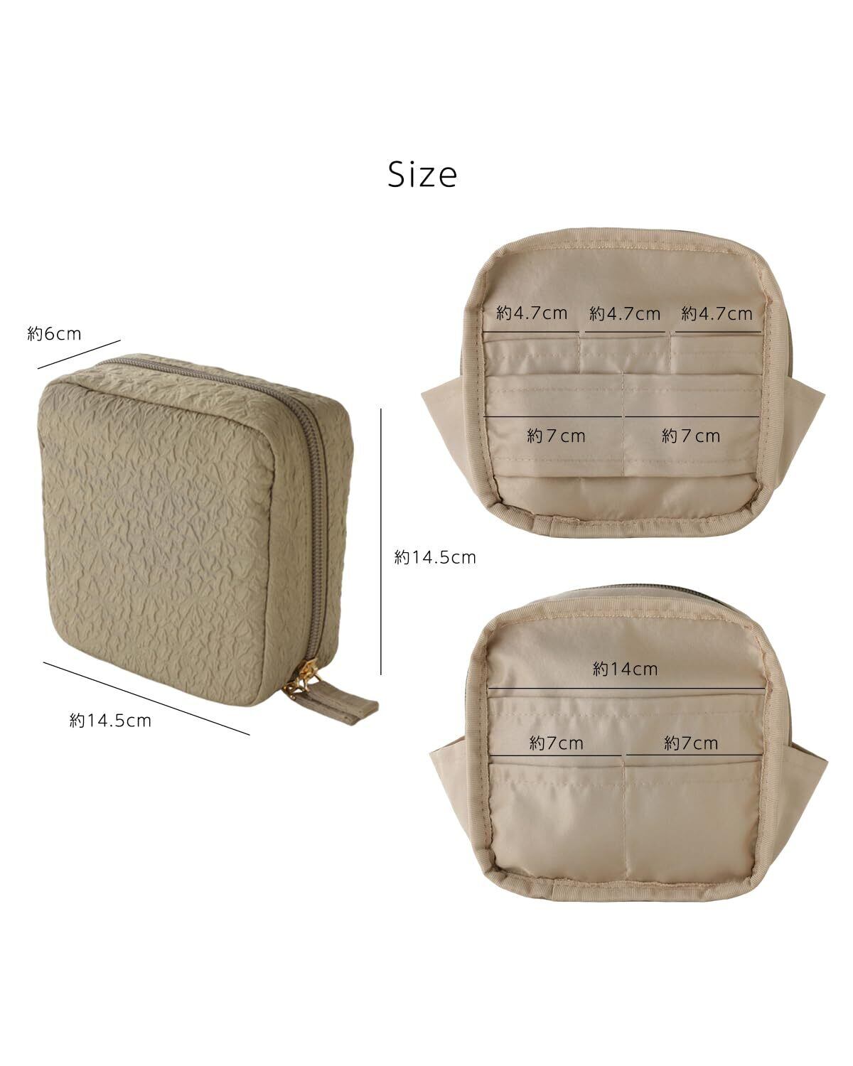 【大きく開いて探しやすい】横約14.5cm 高さ約14.5cm 奥行約6cmとなっております。軽量でコンパクトでありながらチャック部分がフルで開くので、どこにいったかなとなることはありません。またサイド部分には中身が落ちにくいように設計しております。仕分けがしっかりできる機能性抜群コスメポーチです。