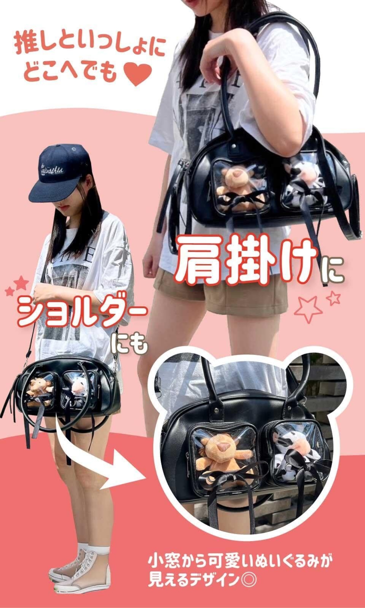 【推し2人を一緒に連れて歩ける】前面に透明窓が2つあるから、ぬいを2体同時に飾れて超うれしい!“W推し”にもぴったり