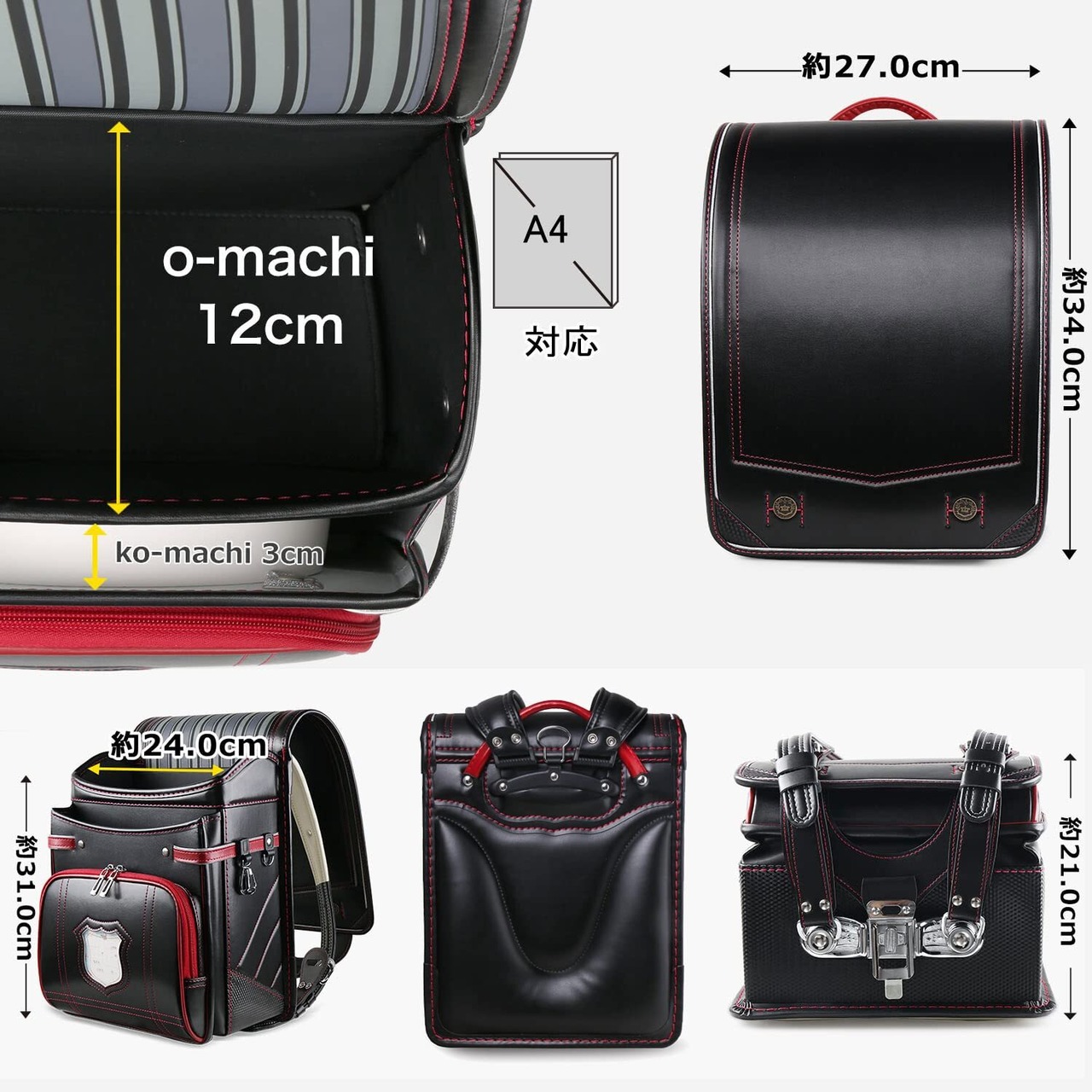 1.【外部サイズ】高さ34cm×幅27m×大マチ19cm 、【内部サイズ】高さ31cm×幅24m×大マチ12cm