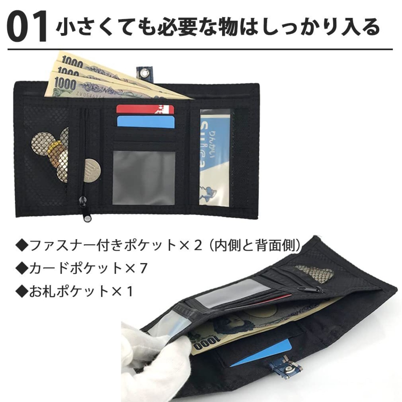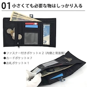 ファスナーポケット×2、お札入れ×1、カードポケット×7 ネックストラップ付き