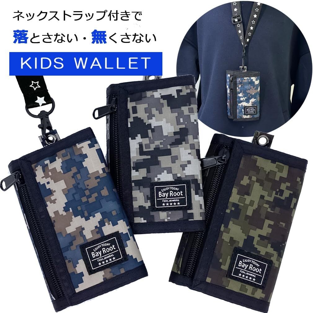 [BayRoot] 財布 子供 男の子 キッズ 小学生 中学生 紐付き デジタル 迷彩 小銭入れ 軽量 薄型 三つ折り 首掛け ストラップ 青 ( ブルー )
