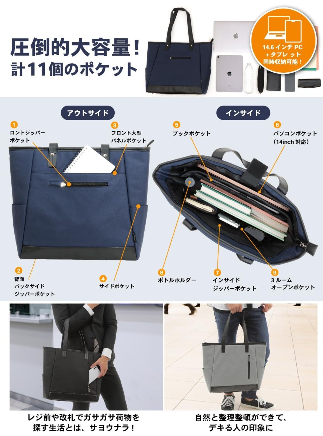 【11ポケットで大容量・機能的なバッグ】ビジネスにもカジュアルにも溶け込む洗練されたデザインは、場面や服装を問わず自然と馴染みます。どの角度から見てもすっきりとしたフォルムで、持つ人のスタイルをさりげなく引き立ててくれる存在。見た目だけでなく、使い勝手もしっかりと考えられた設計なので、毎日の頼れるパートナーとして活躍してくれます。