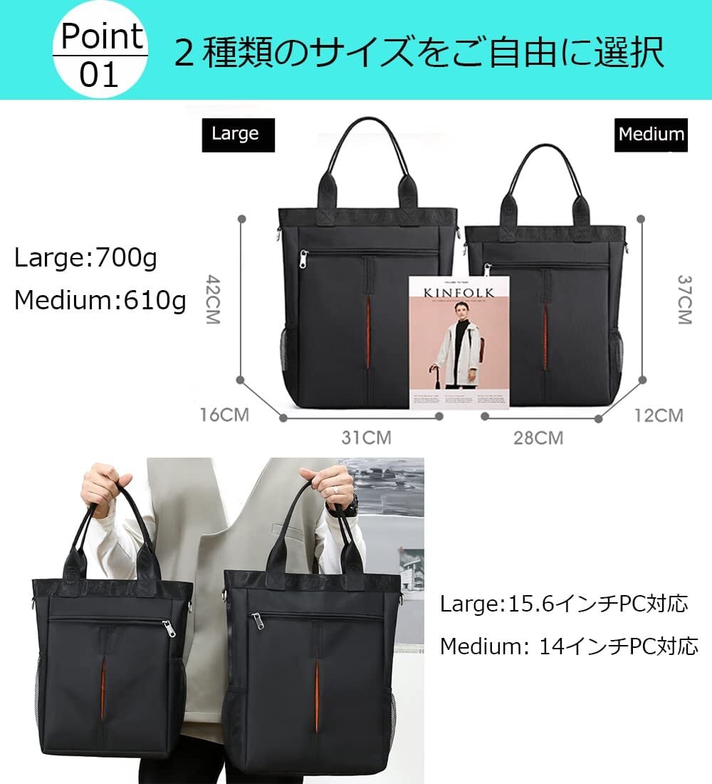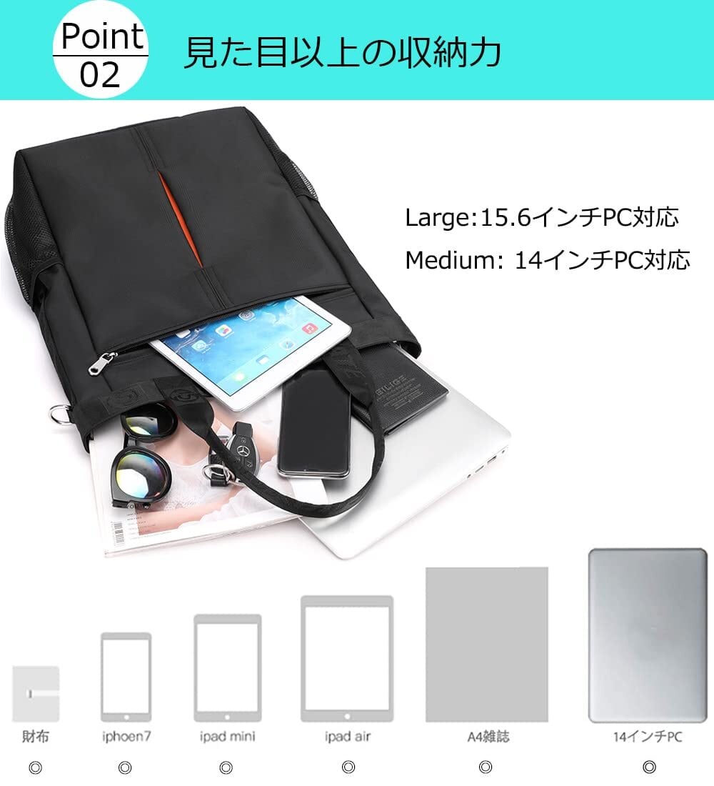 【大容量】A4サイズの書類は勿論、ビジネスには必要のノートPCも楽々入る大容量です。Largeサイズは15.6型PC対応、Mediumサイズは14型PC対応。ほかに手帳、スマートフォン、折り畳み傘、化粧品など必要な物が十分入るからこれ一つでお出かけ可能です。