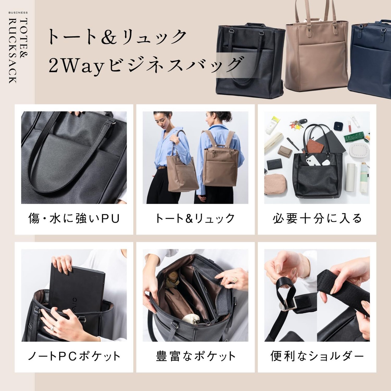 【シーンに合わせてトートバッグ・リュックサックとして使用できる2WAY】リュックベルトをトートバッグ本体に内蔵しており、リュックとしてもご使用頂けます。 また使用しないリュックベルト・トートバッグ用持ち手はポケットに収納可能。【傷・水・汚れに強いPU(合成皮革)】天然皮革に似た質感や風合いを持ちながら傷・水・汚れに強いPU(合成皮革)を採用。 表面は高級感のあるサフィアーノ調を採用しており、きれいめバッグはビジネスシーンにピッタリです。