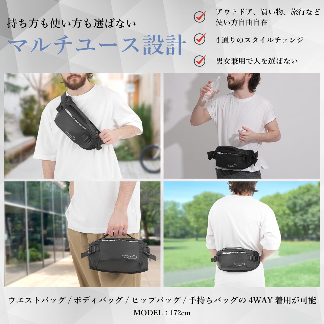【使いやすさが光る!どんな場面でも活躍する万能バッグ】このボディーバッグは、日常使いから旅行まで幅広いシーンで活躍する優れたアイテムです。28cm×15cmのサイズに大容量のポケットを備えながら、わずか約0.21kgの軽量設計で、持ち運びがとても快適。ウエストは60~100まで幅広く調整可能!男女兼用で使用できます。さらに、スタイリッシュなデザインが魅力で、斜め掛けやウエスト、手持ちなどシーンに合わせて自由に使い方を選べます。使い勝手の良さを追求したこのバッグで、毎日の持ち物をスマートにまとめましょう!