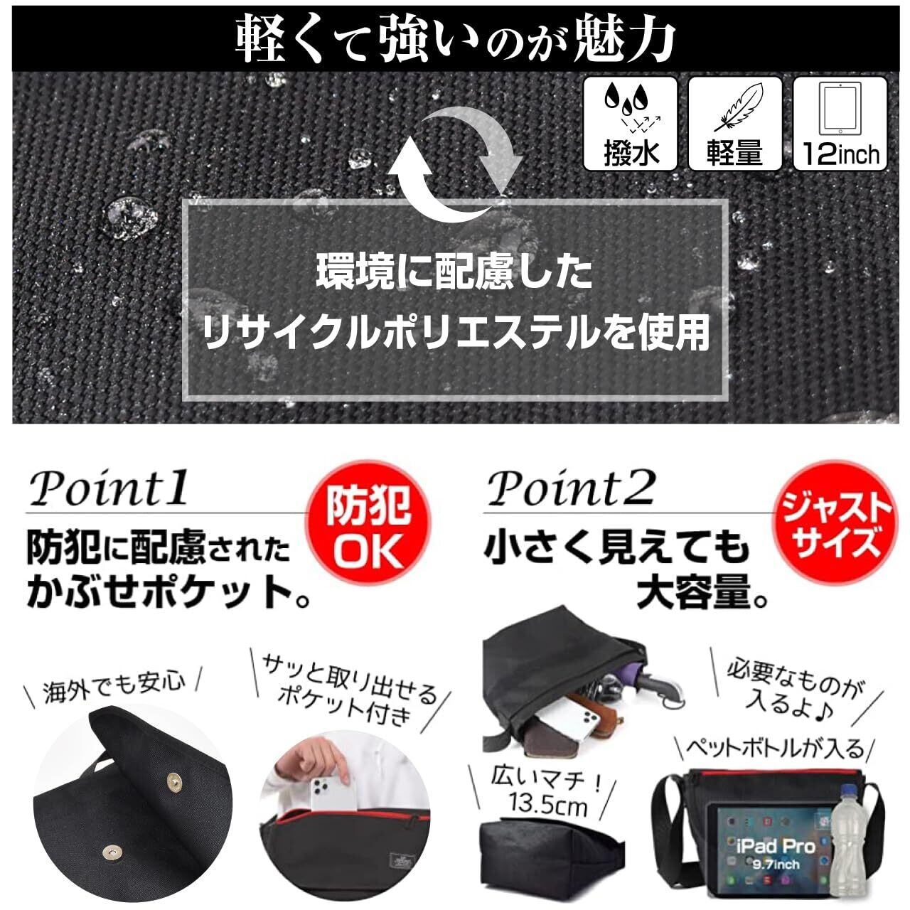 ペットボトルや9.7インチ(24×17cm)タブレットもすっぽり入れることが可能な大容量なメインポケットにはファスナーが付いて中身が飛び出さない設計。自転車やバイクでのお出かけにも最適です。
