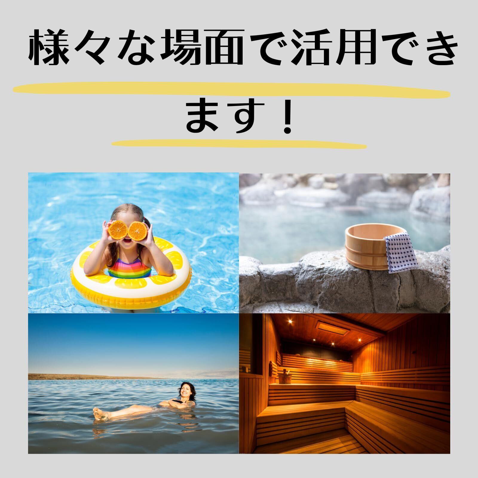 ・お風呂、温泉、サウナ、岩盤浴、プール、水泳、海水浴、ジム、スパ など様々な場面で活用できます。