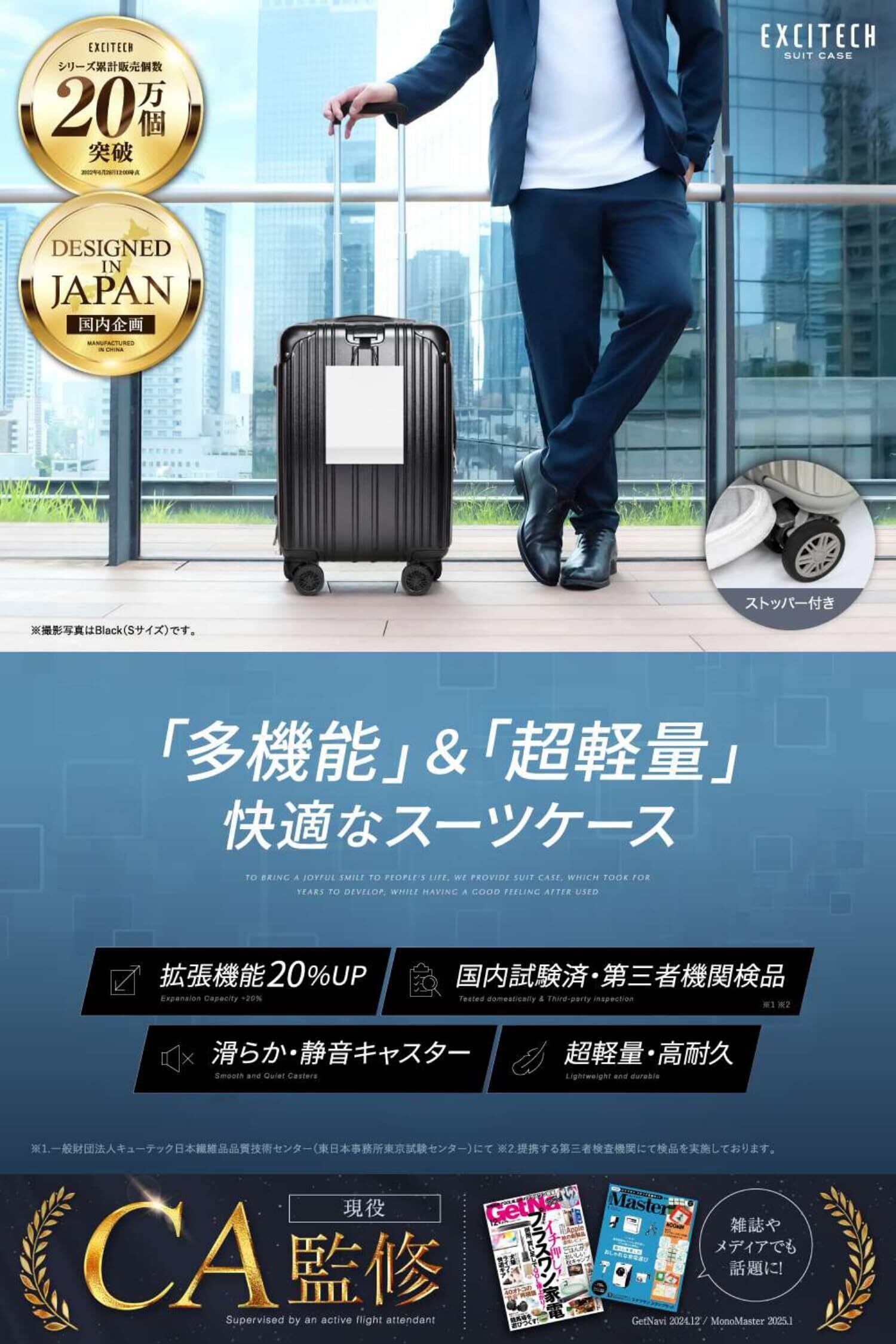 【人気商品】[EXCITECH Biz] 【現役客室乗務員監修】スーツケース キャリーケース 拡張機能 ストッパー付き 超軽量【日本企業企画】Mサイズ 68L キャリーバッグ 旅行 ビジネス 出張 3〜6泊 ブラック