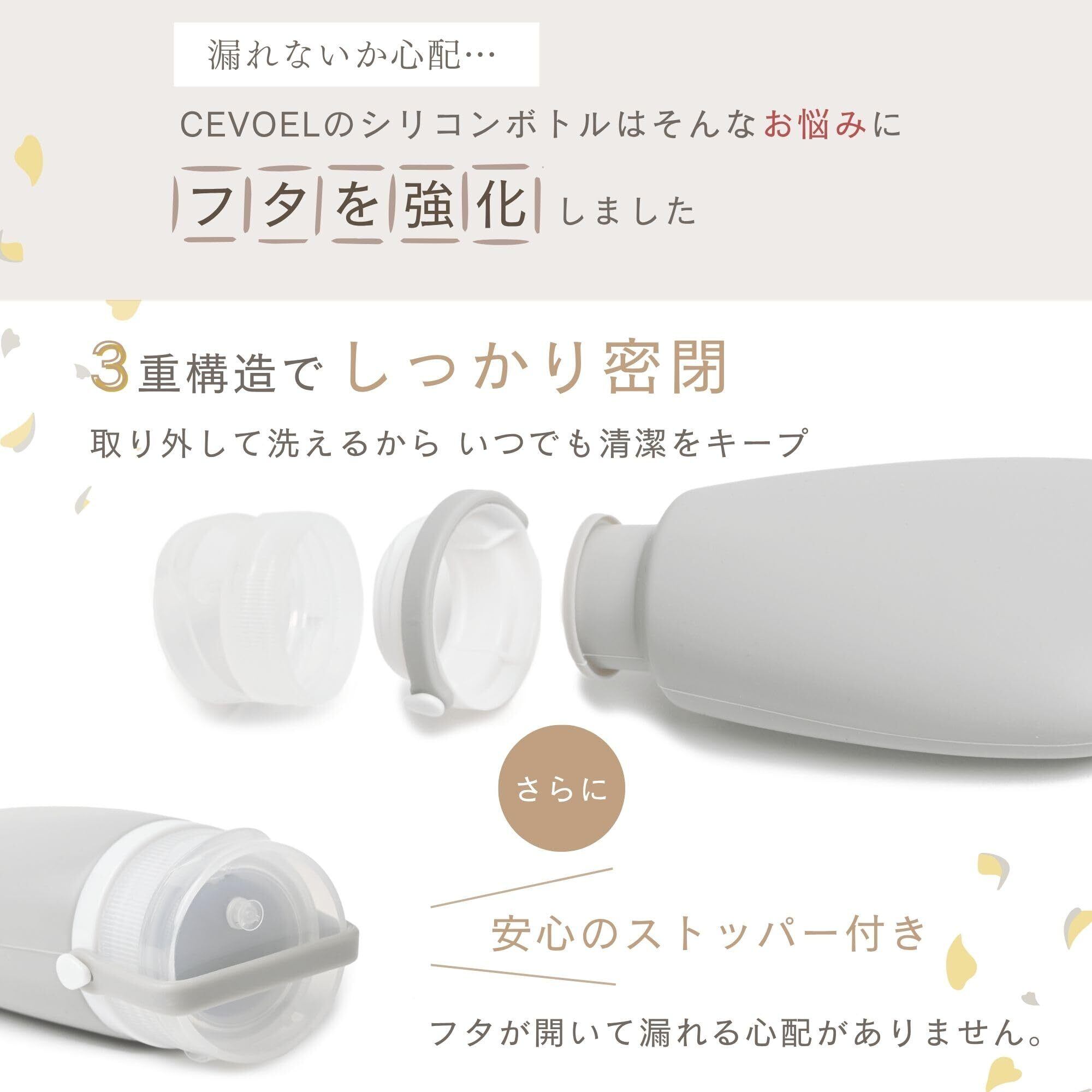️【シリコン素材&広い注ぎ口が使いやすい!】CEVOELの トラベルボトル は、シリコン素材を使用しているので、やわらかく最後まで液体を出しやすいのが特徴です。また、広い注ぎ口だから シャンプー やコンディショナーなどの 詰め替え やお手入れが簡単!衛生的です