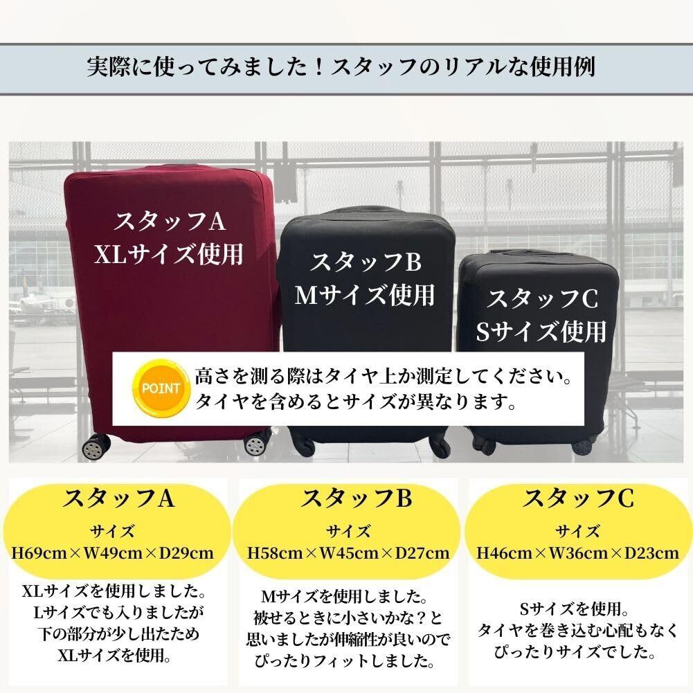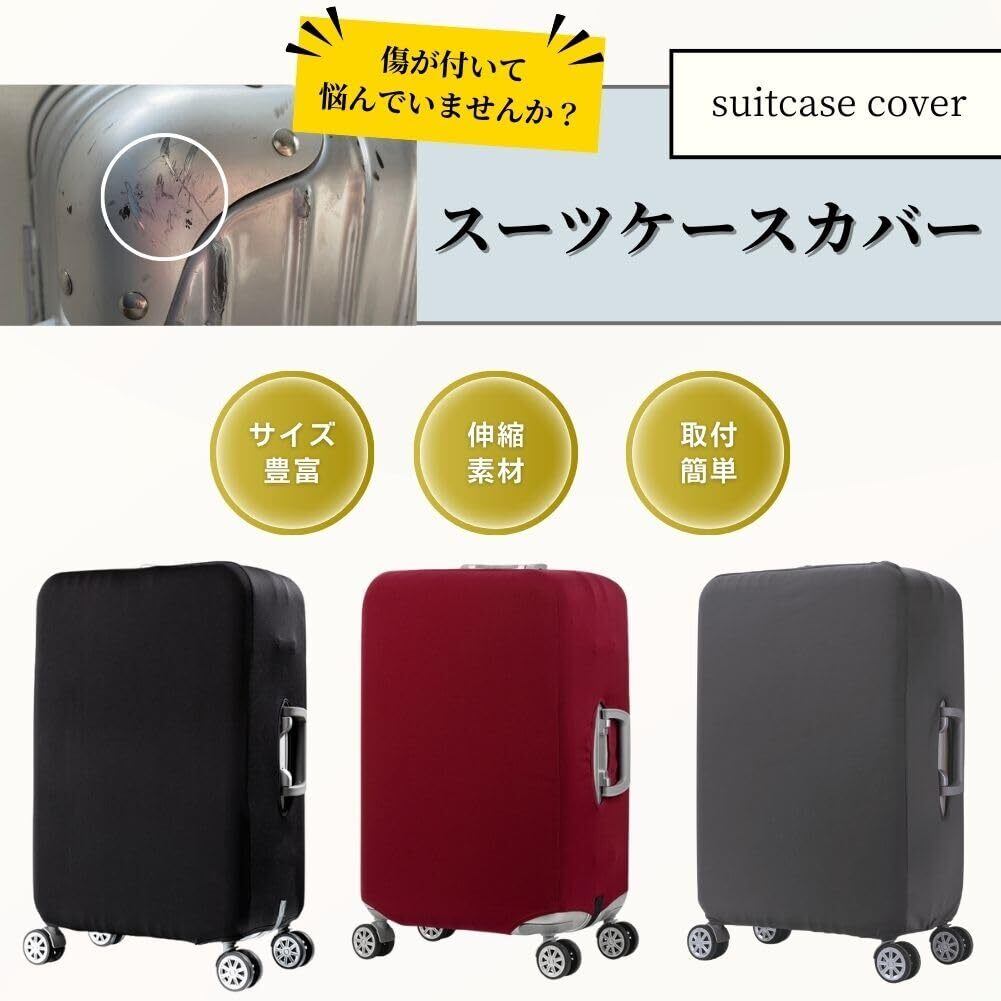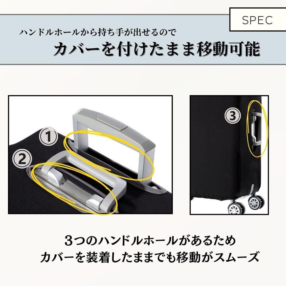 【伸縮性あり】生地は厚みがあり、素材はポリエステルスパンデックス生地を使用しているため、耐久性があり伸縮性も非常に高く劣化や変形が少ない生地です。4サイズあるためいろんなサイズのキャリーケースに対応可能。ケースの形や大きさにぴったりフィットします。